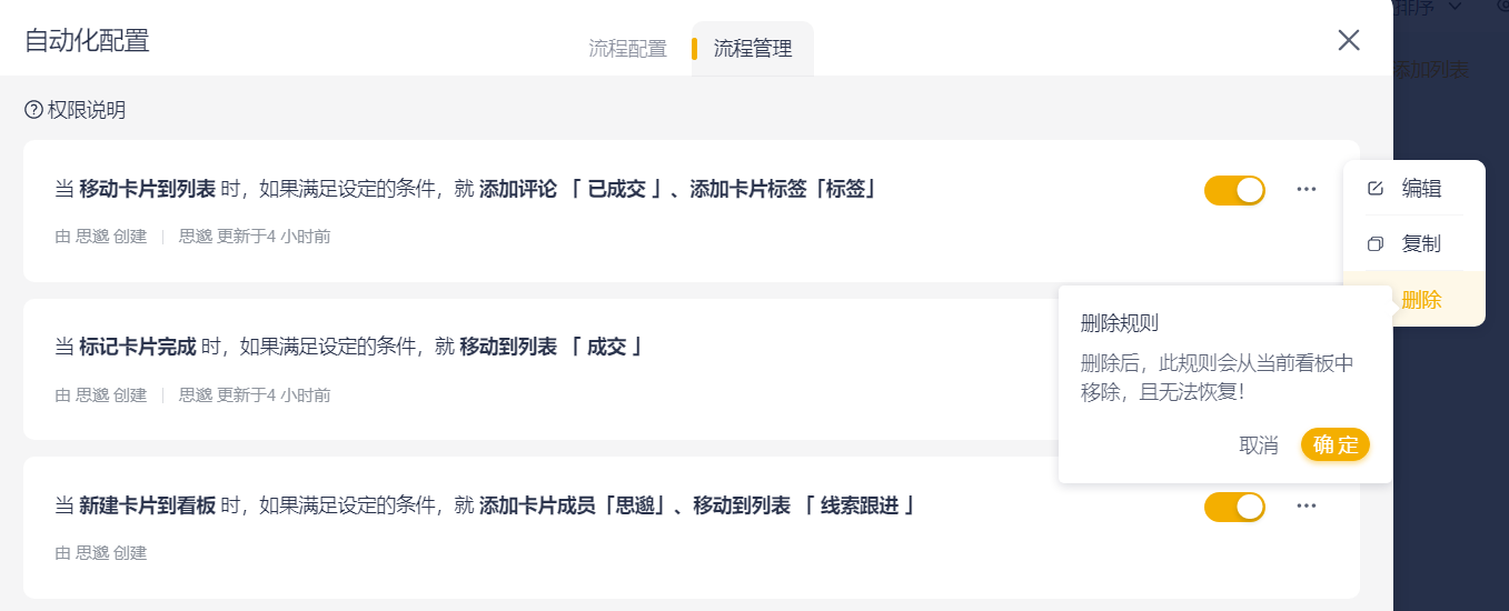 击最右侧“缩略菜单”——可对流程进行“删除”,删除后看板不再执行该流程。