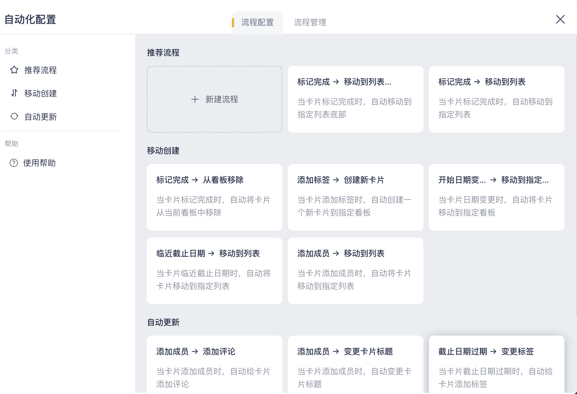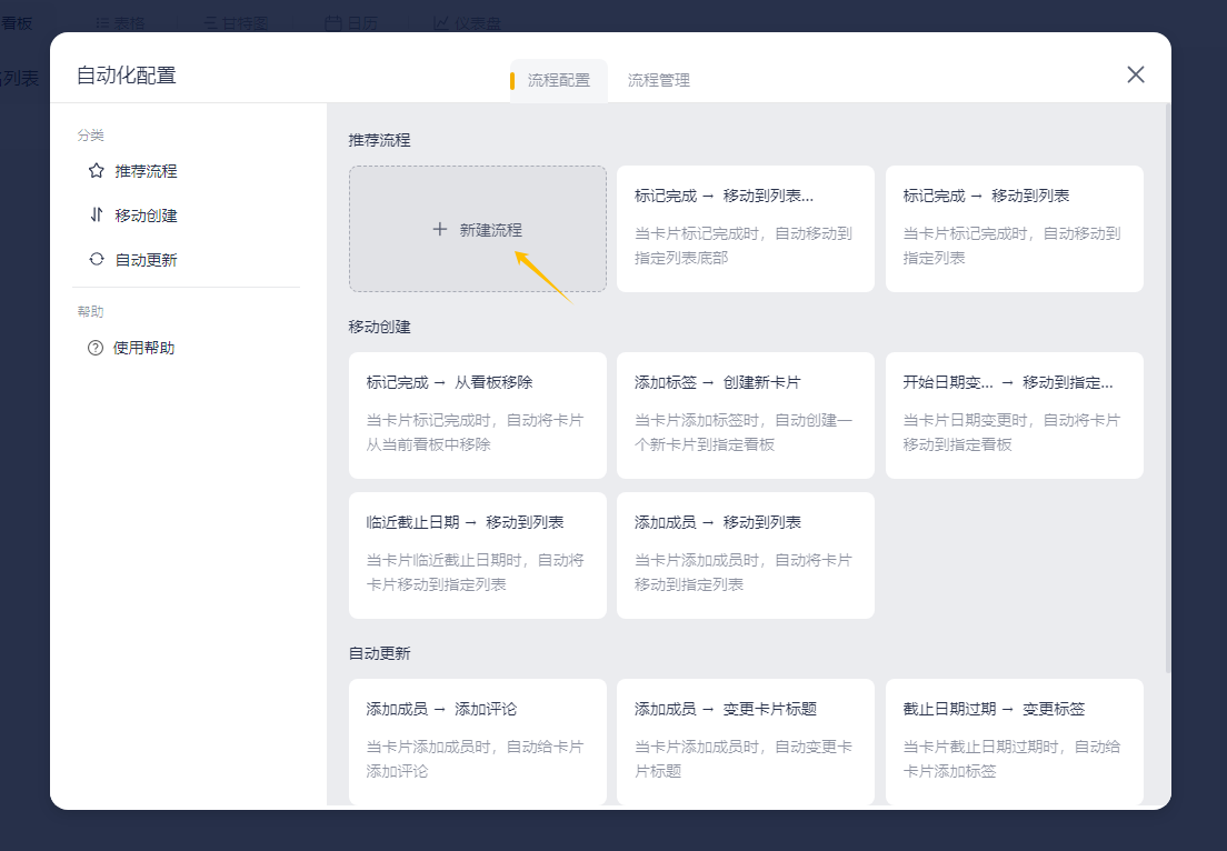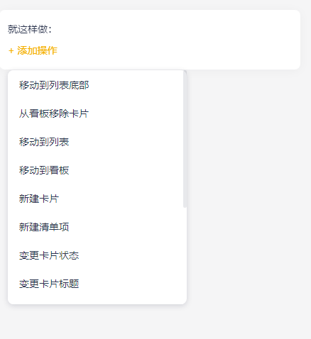 这里需要我们设置出自动化流程开始的先决条件。当我们在看板上确定进行某一种操作后,将会触发自动化流程。可选择新建卡片到看板、标记卡片完成、移动卡片到列表、添加卡片成员、添加列表等 12 条规则。