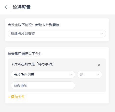 比如:我们可以在设置——当“新建卡片到看板”时,如果满足卡片是在“待办事项”列表中创建的,那么将会执行自动化流程程序,进行某些自动化操作。这里可选择包含“卡片所在列表”等在内的 9 类条件。