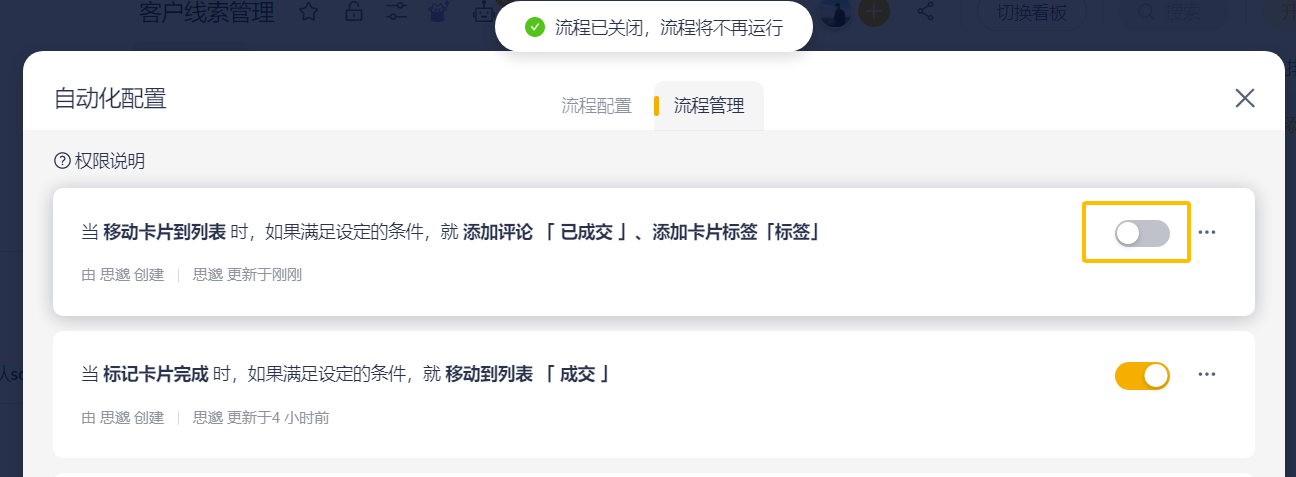 点击流程右侧的按钮,可关闭流程,关闭后流程将不再运行。再次点击后可恢复。