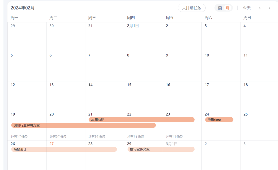 日历视图分为周和月视图,可以切换使用。若视图单位切换为周,拖动矩形边框可把任务排期精细至每天的具体时段。