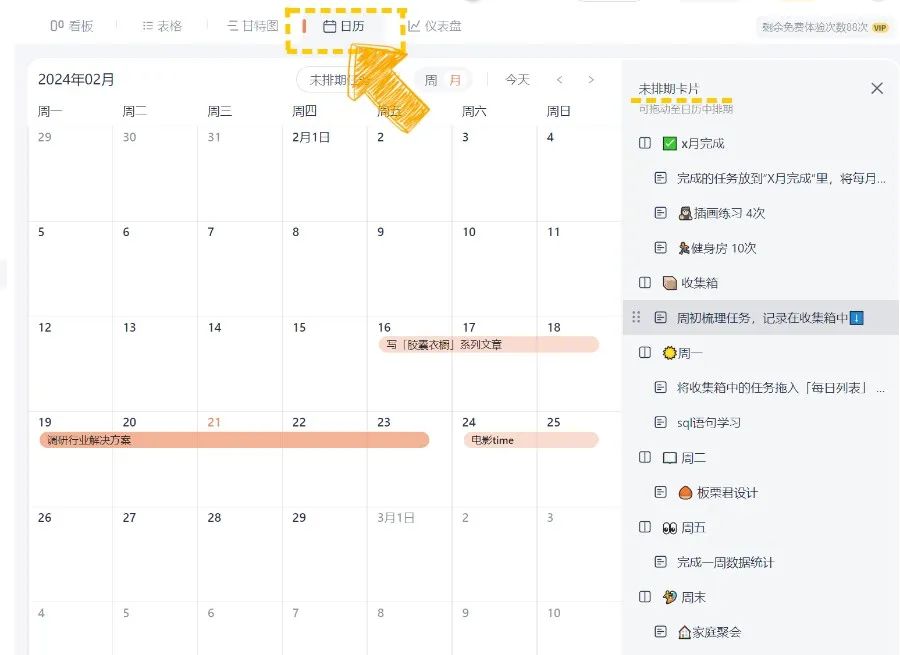 创建或进入一张看板后,可切换至日历视图,点击【日历】即可切换视图