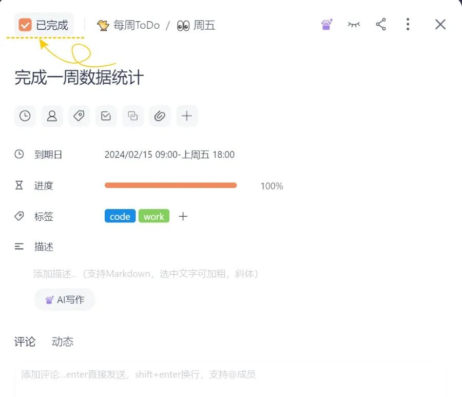 在卡片中勾选已完成,日历视图中对应任务进度条的颜色变深。完成情况一目了然。