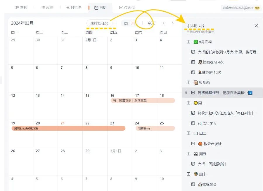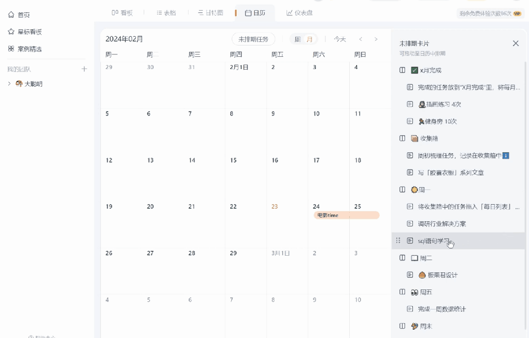 未设定时间的任务卡片会自动归类至“未排期任务”可以手动拖动到日历视图中,创建出时间段,并通过拖动时间段长度,来控制时间长短