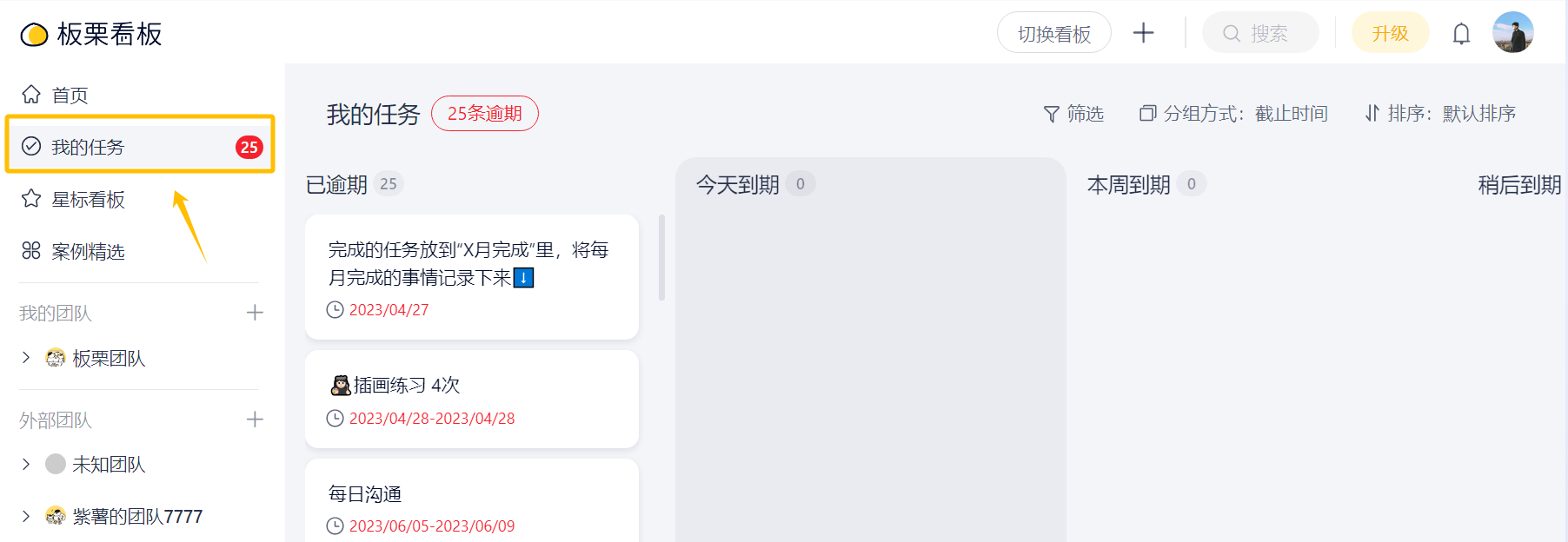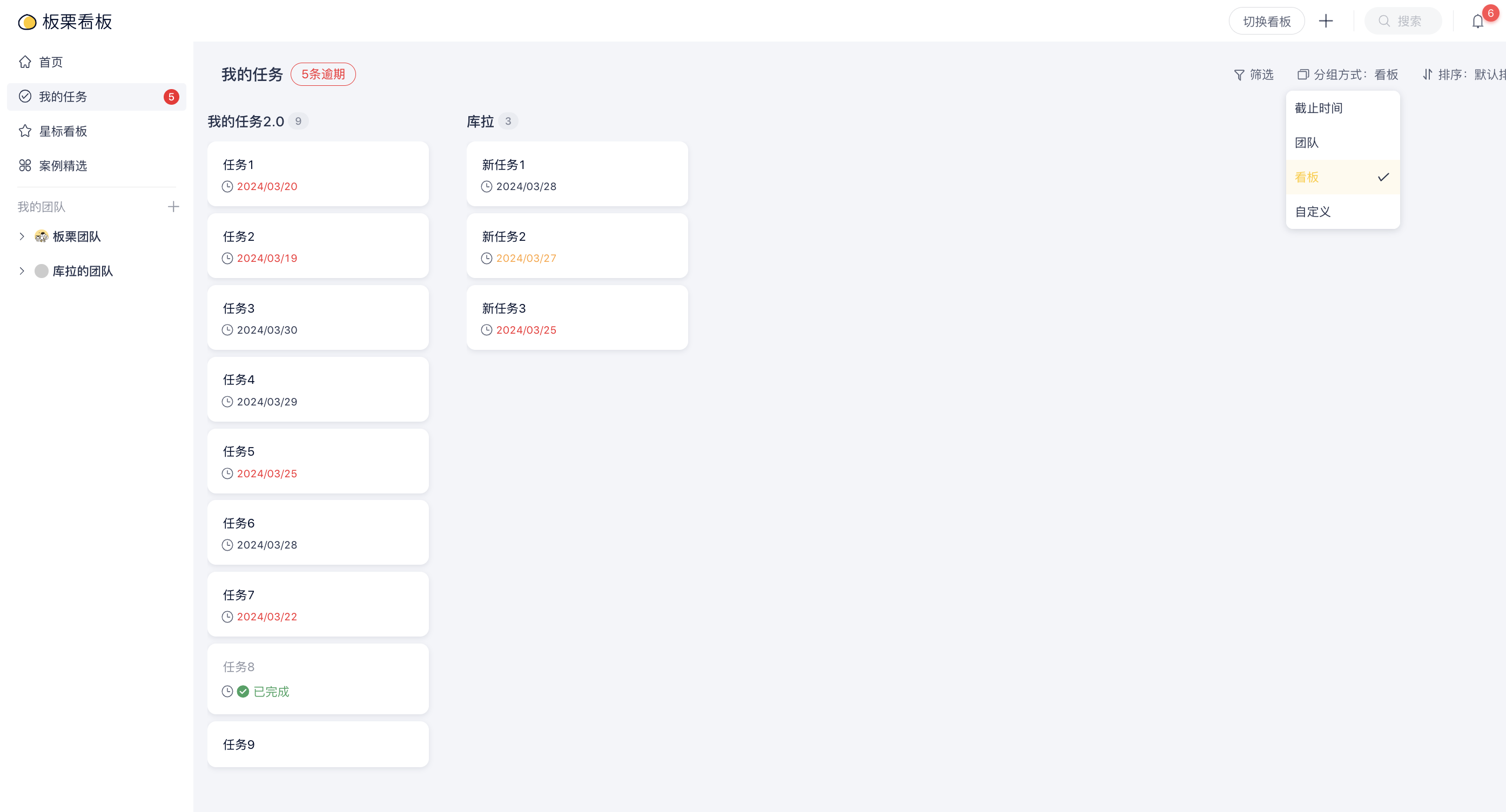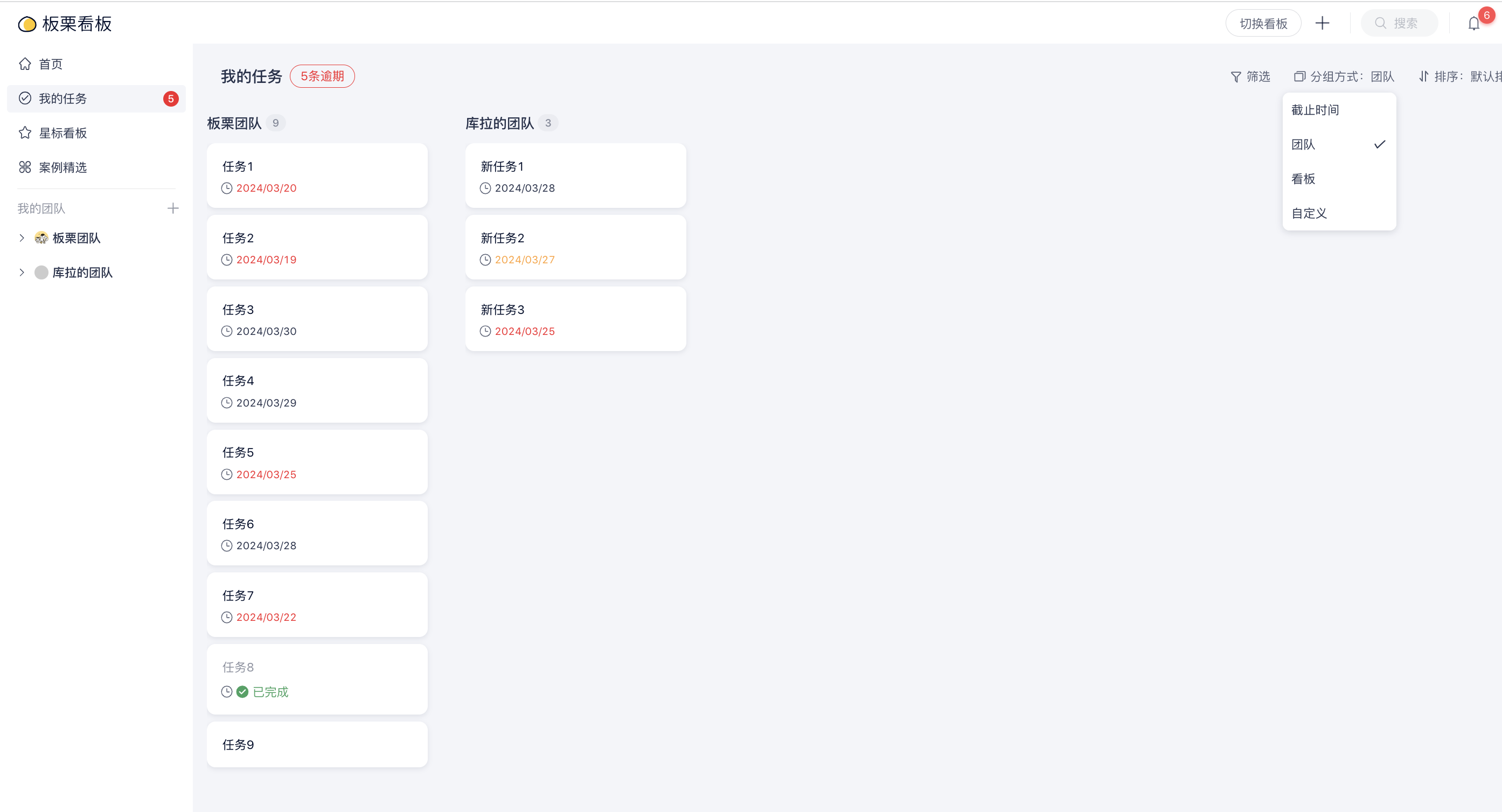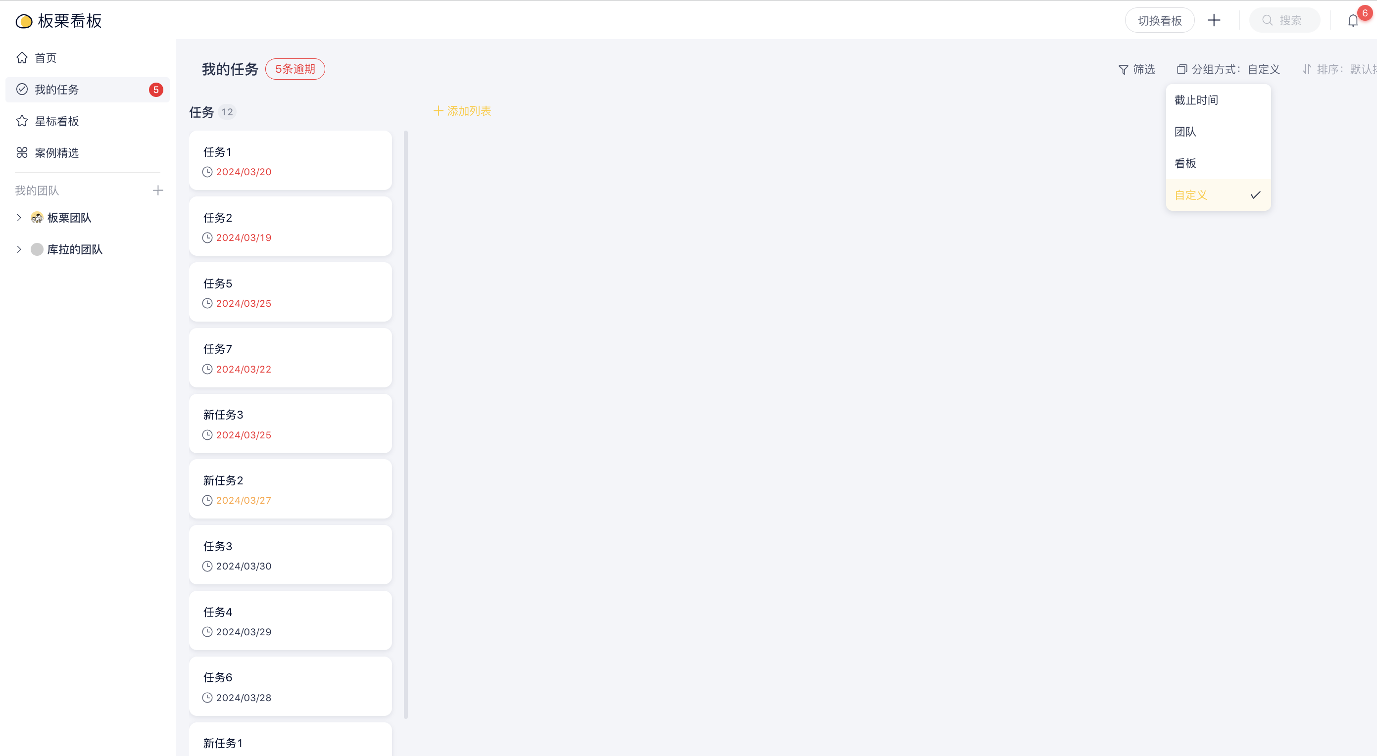 目前按四种方式进行分组:截止时间(默认)、团队、看板、自定义