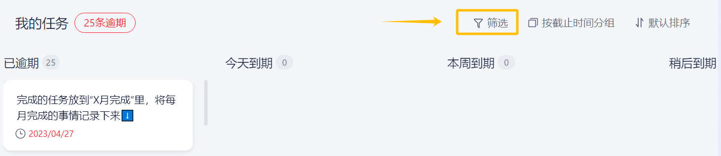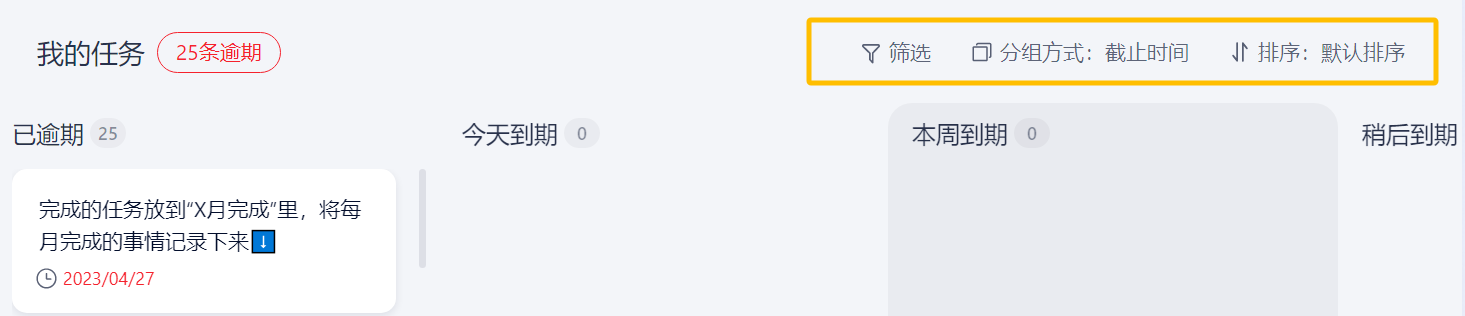 - 稍后到期列表:展示本周以外,设置了到期时间的任务;