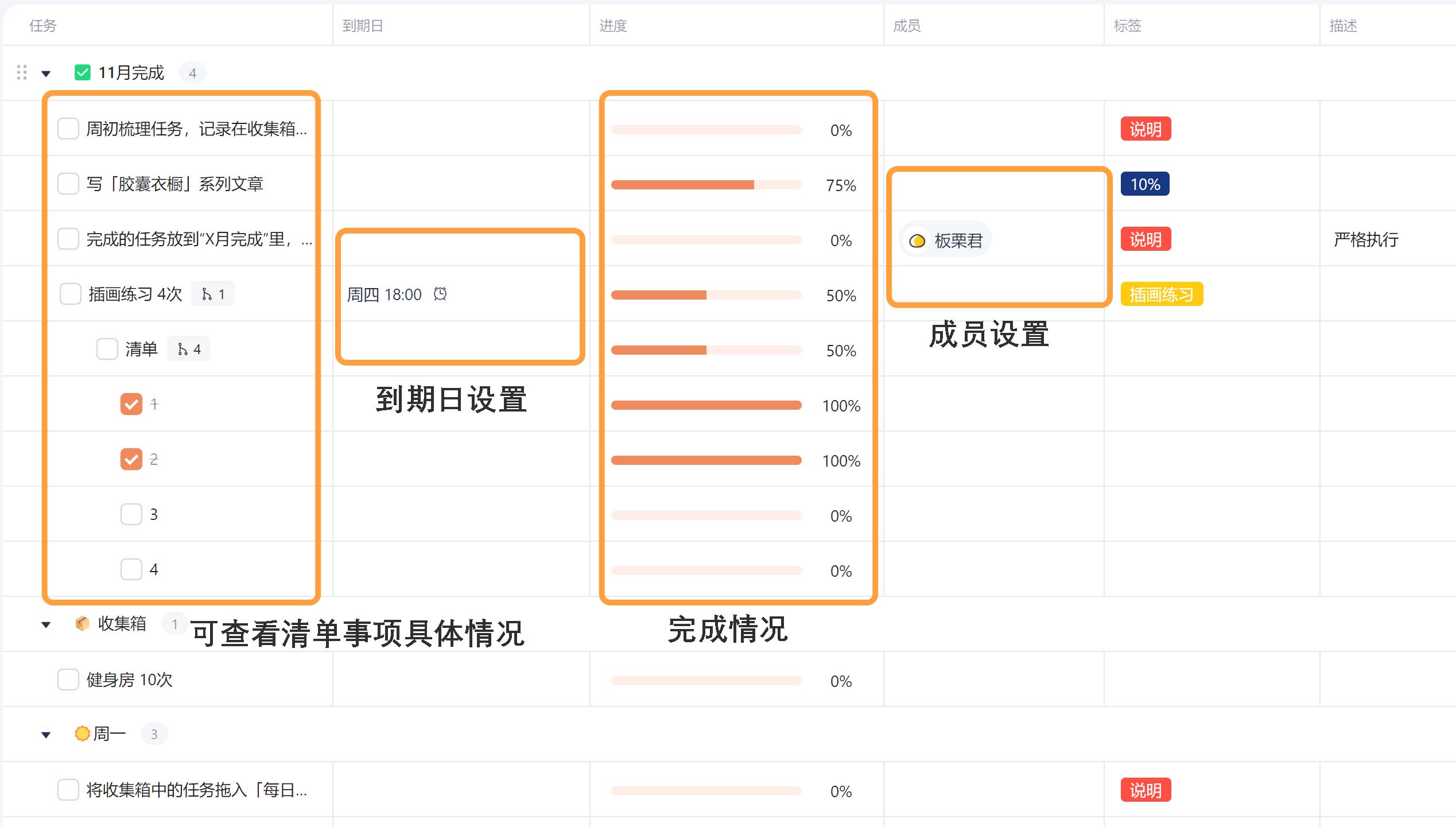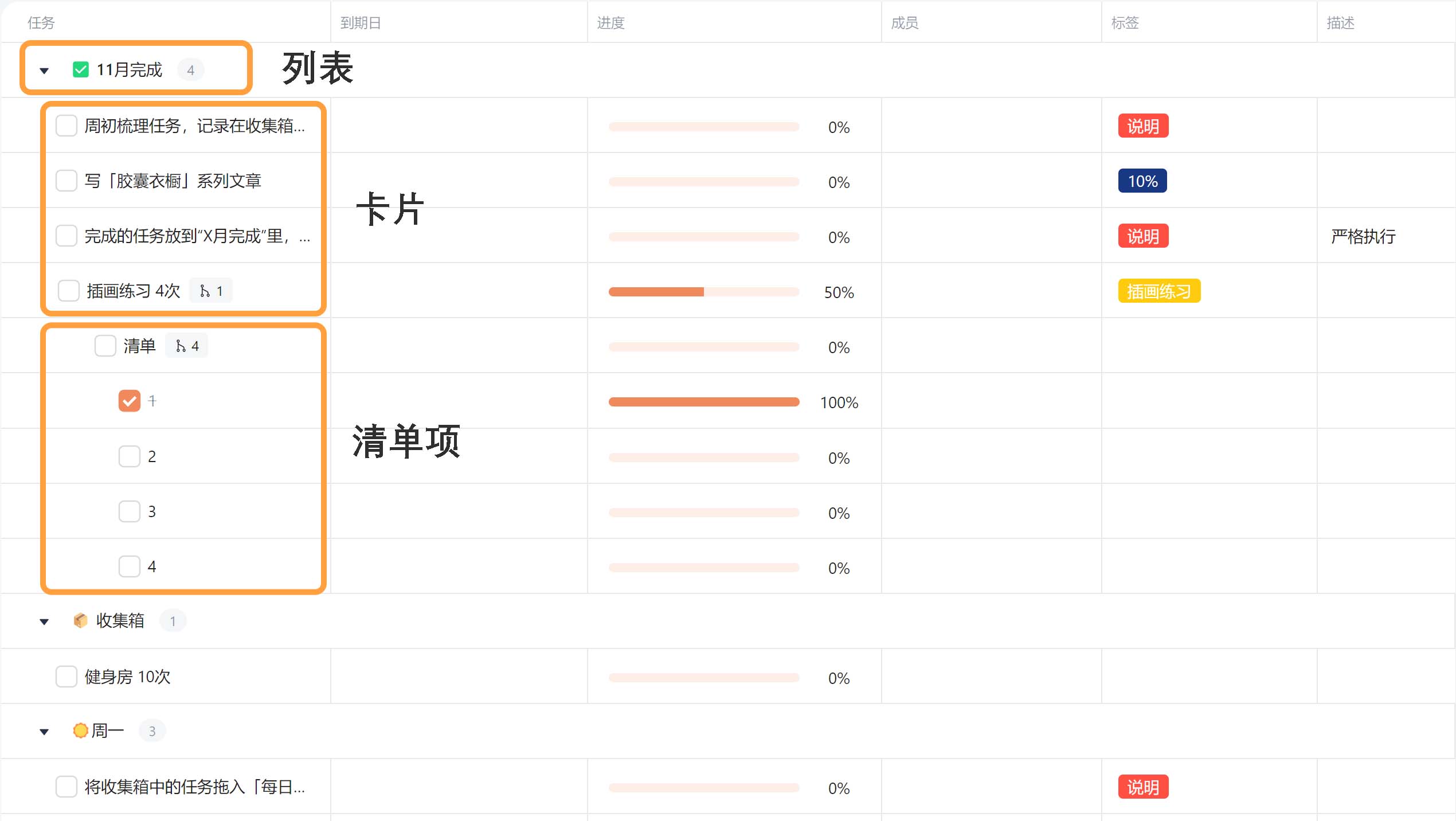 顶部为字段标题栏,同卡片详情中的字段内容一致,如到期日、进度、成员、标签等。字段标题无法修改,但可以移动顺序(除任务标题栏外)。