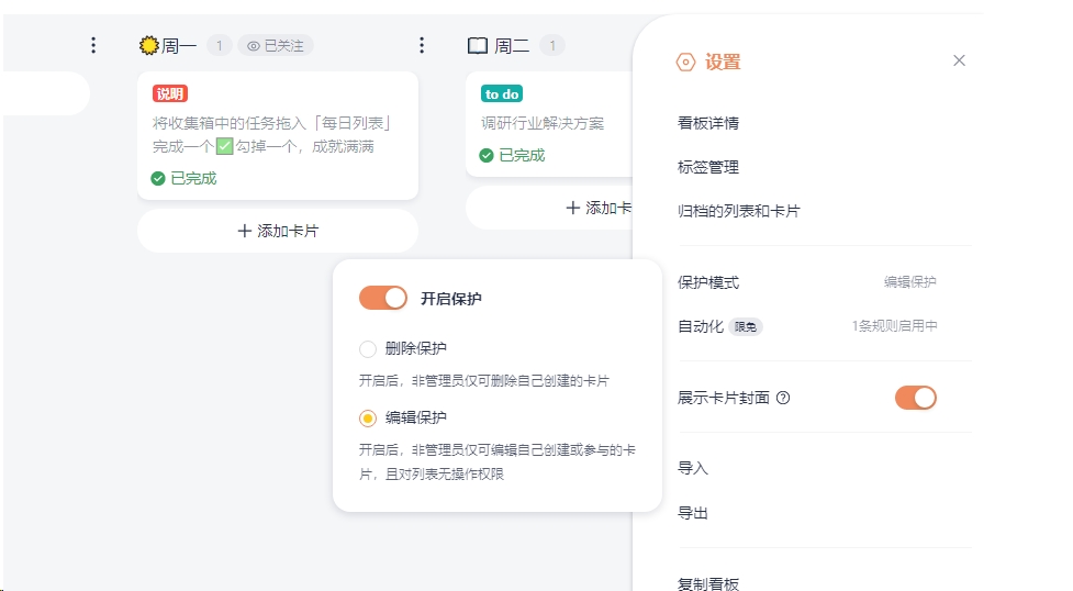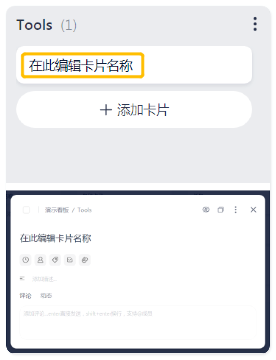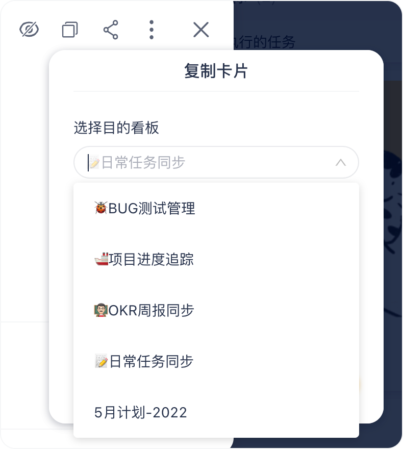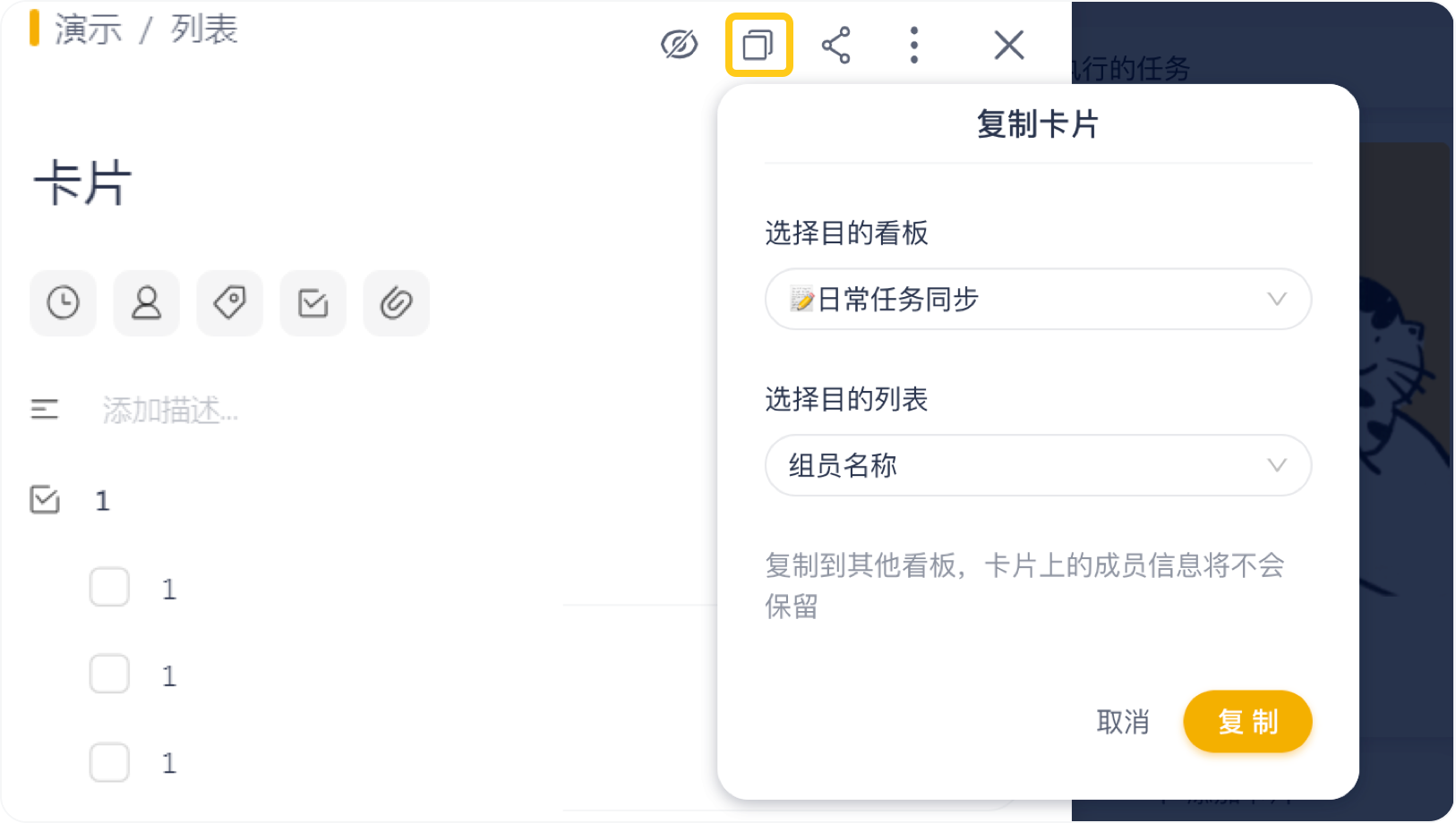 - 将卡片复制到其他看板时,仅保留卡片所有内容、卡片附件,不保留卡片成员。