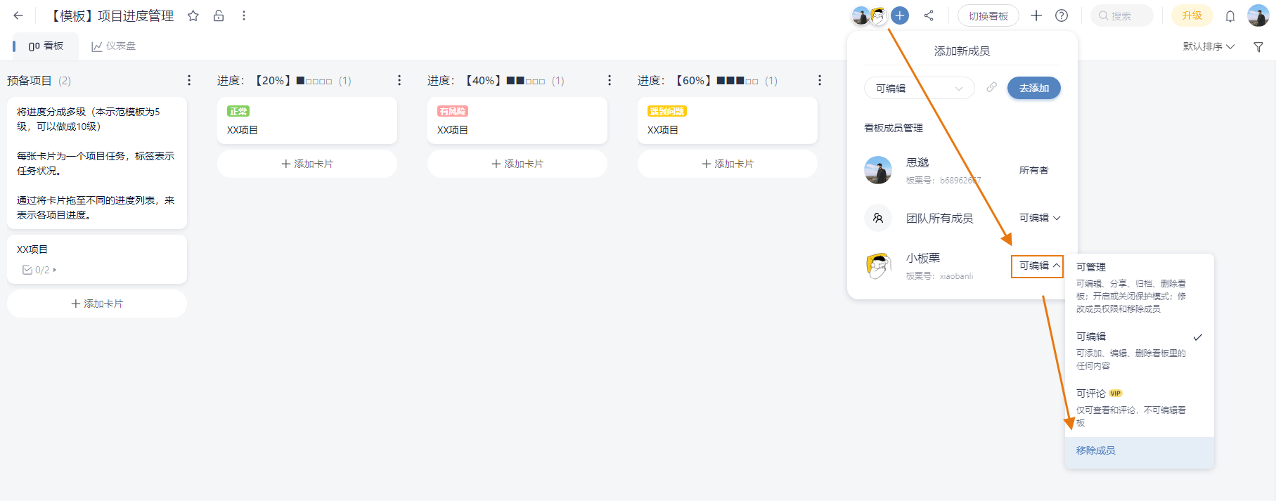 如果不想让某个成员看到全部团队中到看板,可以不用将其移除团队,而是设置为临时成员,这样对方仅能查看到被添加为看板成员到看板。