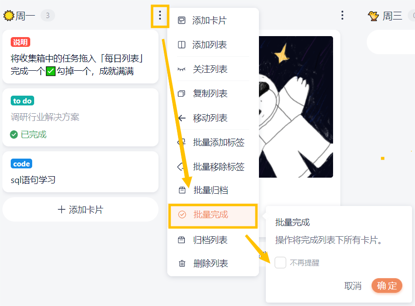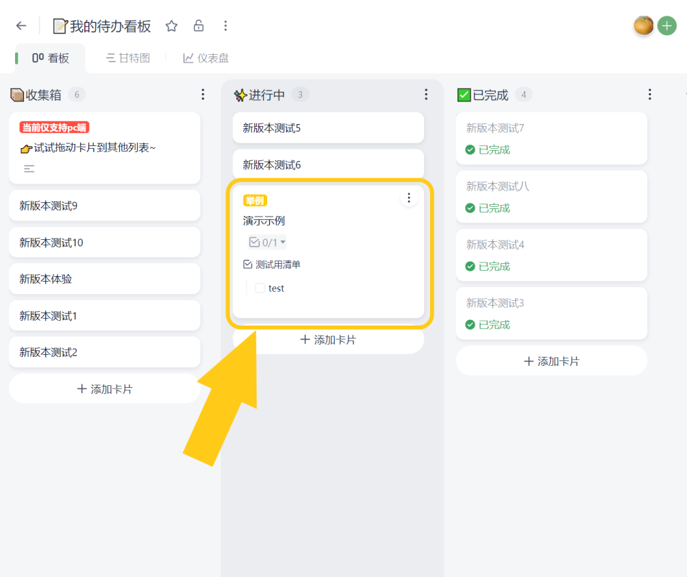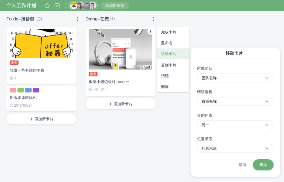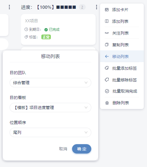 在电脑端,如果列表中的卡片太多,不方便通过拖拽方式移动卡片,也可以通过卡片快捷菜单将卡片直接移动到目标列表。支持跨看板移动(需是目标看板所属团队的团队成员)。