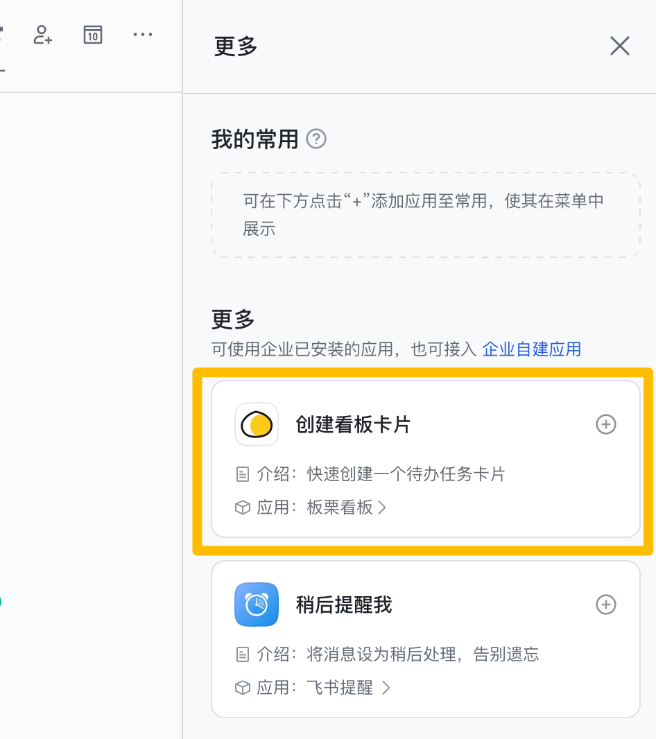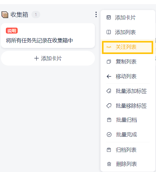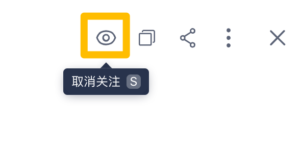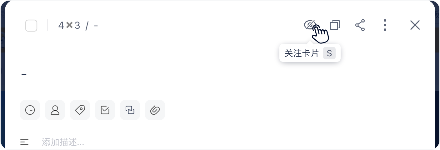 在卡片详情页里,点击右上角第一个图标,可关注当前卡片,接收该卡片的关键操作提醒(如:卡片删除、卡片拖动、到期日提醒、到期日完成等)。当设置为当前卡片的成员后,会将此成员设置为关注此卡片。