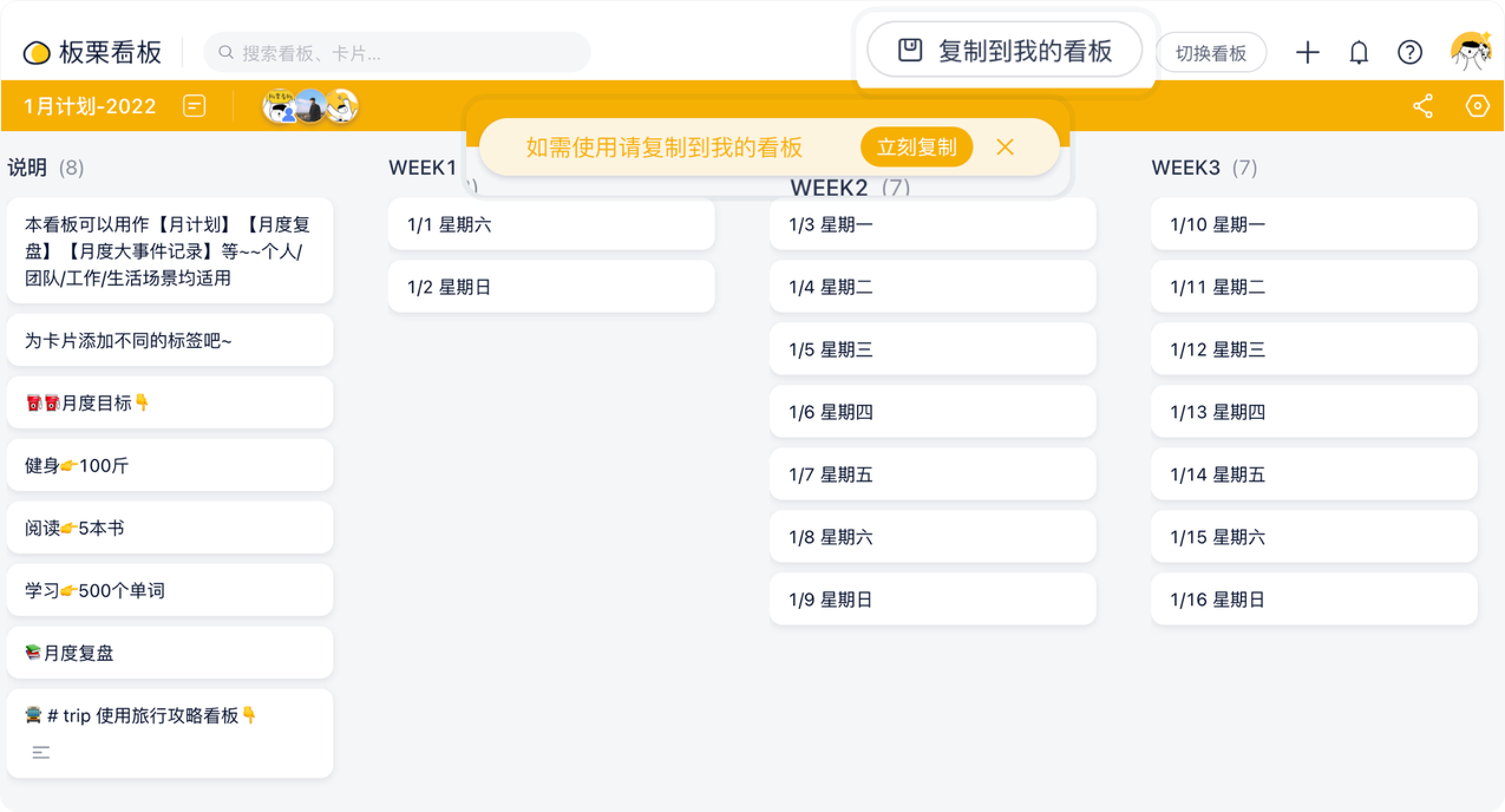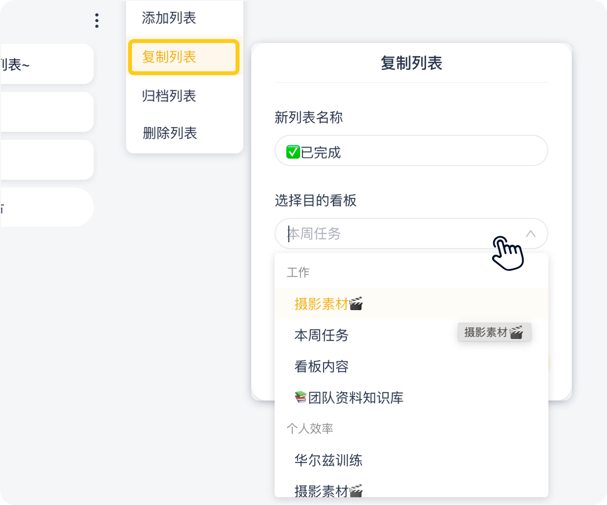 能将卡片复制到任一已加入的看板,以及该看板下的任一列表中。