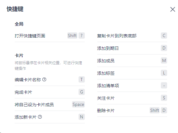 T:编辑卡片名称 G:将卡片状态变为“已完成”(即完成当前卡片) Space(空格键):将自己设为该卡片的卡片成员,再次按下空格键则取消添加 N:添加新卡片(注:需要将鼠标悬停在“添加卡片”或列表名称下,才能使用快捷键) C:复制卡片到卡片当前所在列表的底部 D:添加到期日 M:添加卡片成员 L:添加卡片标签 -:添加卡片清单 S:关注当前卡片 shift+D:删除卡片