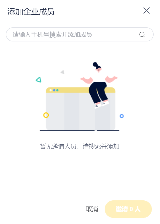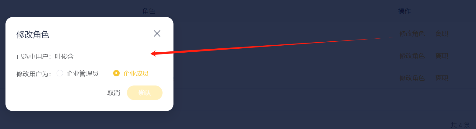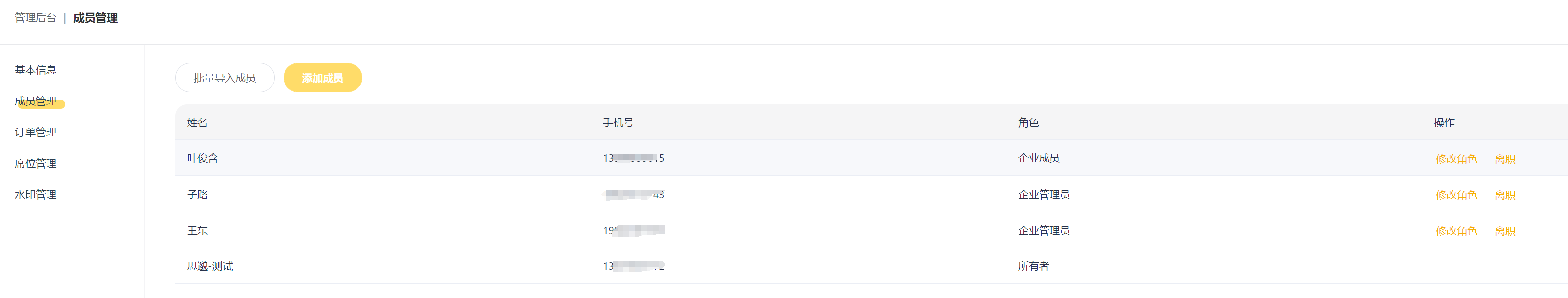 在成员管理中,企业的所有者(一般是创建人)可以自由进行企业成员的添加、离职,以及权限的修改。