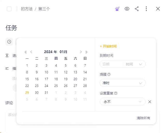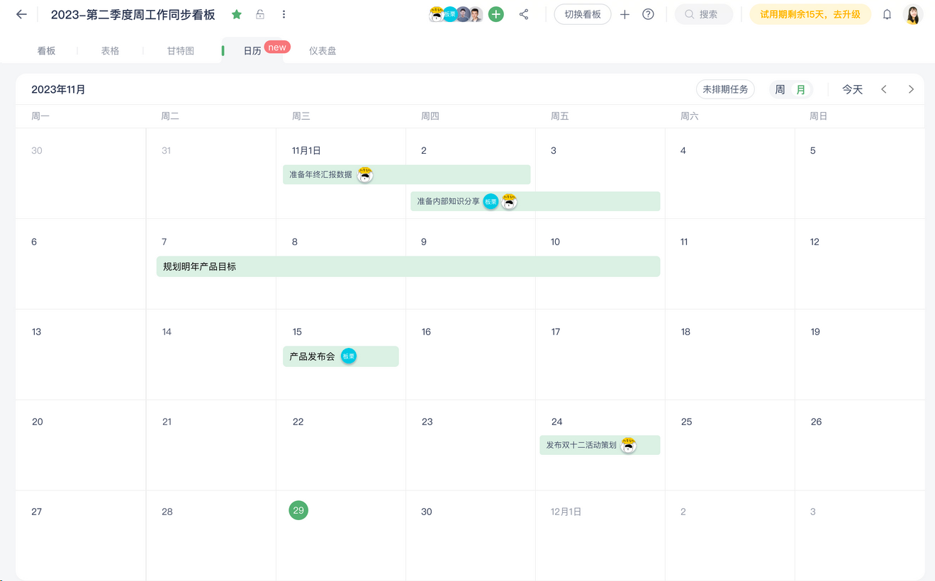 - 日历视图能够将看板中设置了时间的任务转化成直观的时间轴,使用户能够更容易地了解事件和任务的时间安排。用户可以迅速浏览一段时间内的活动,提高对时间的感知力。