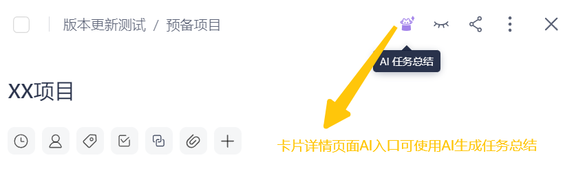 输入卡片重要数据,点击卡片详情中提供的 AI 入口即可 AI 生成任务总结。 AI 生成内容可复制,编辑,反馈,取消。