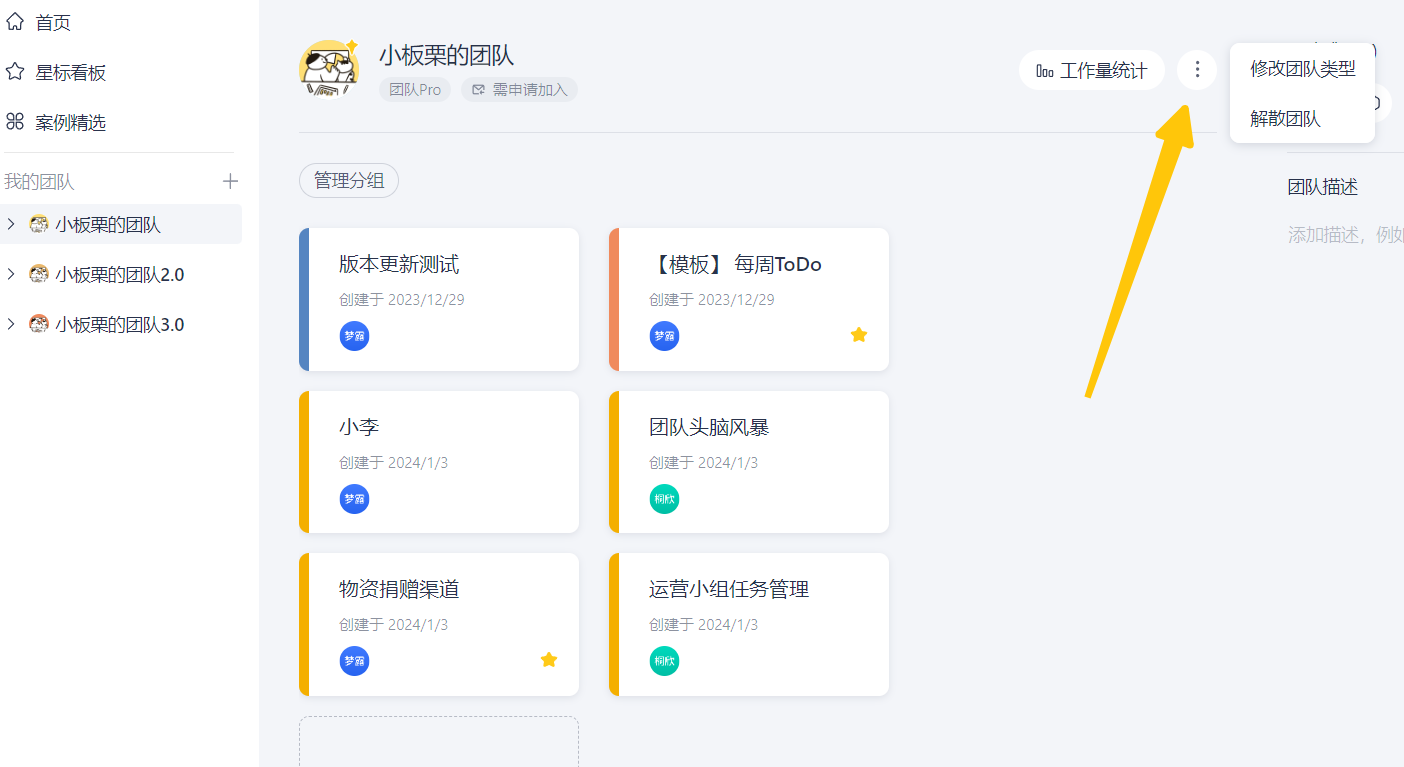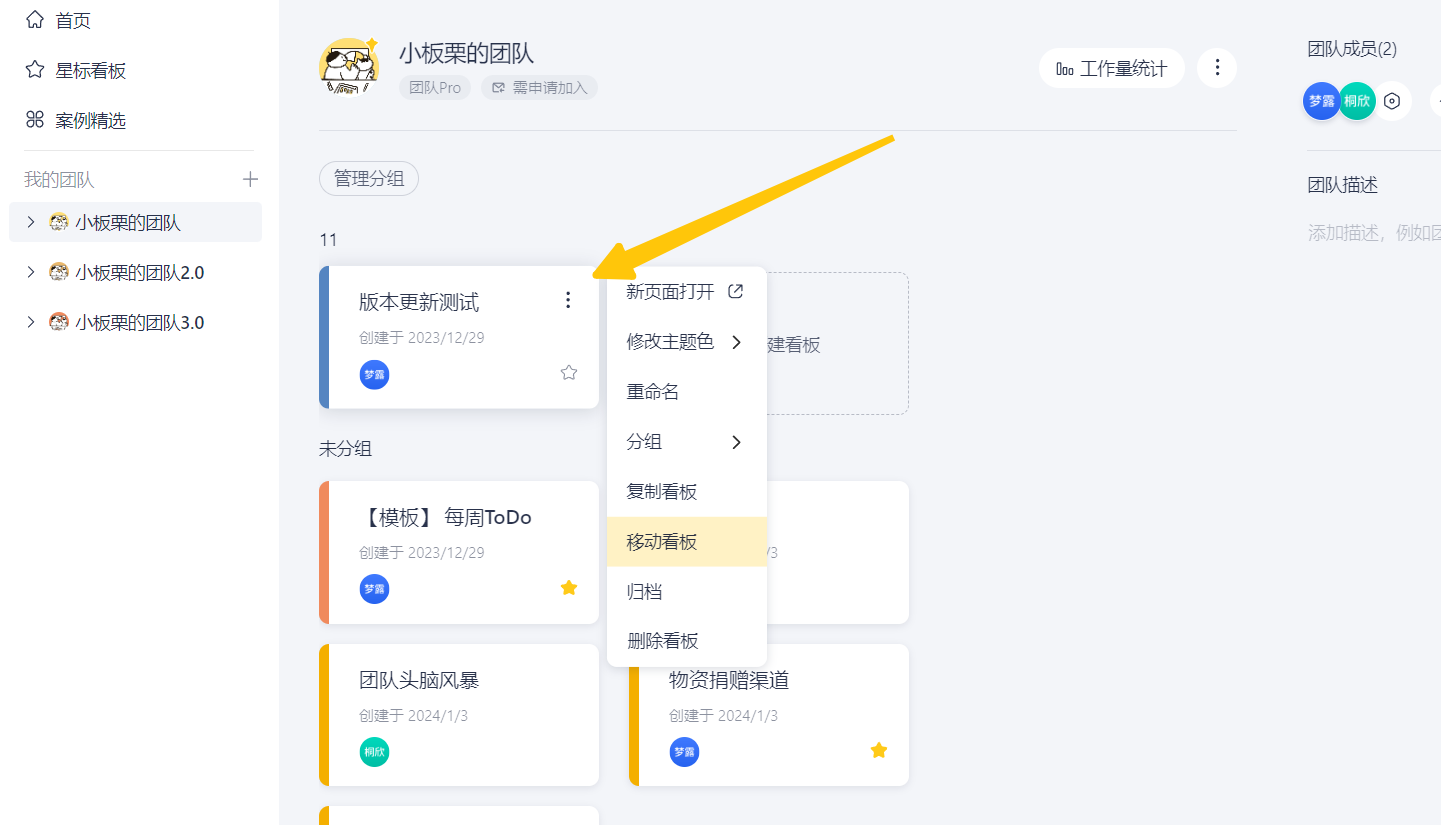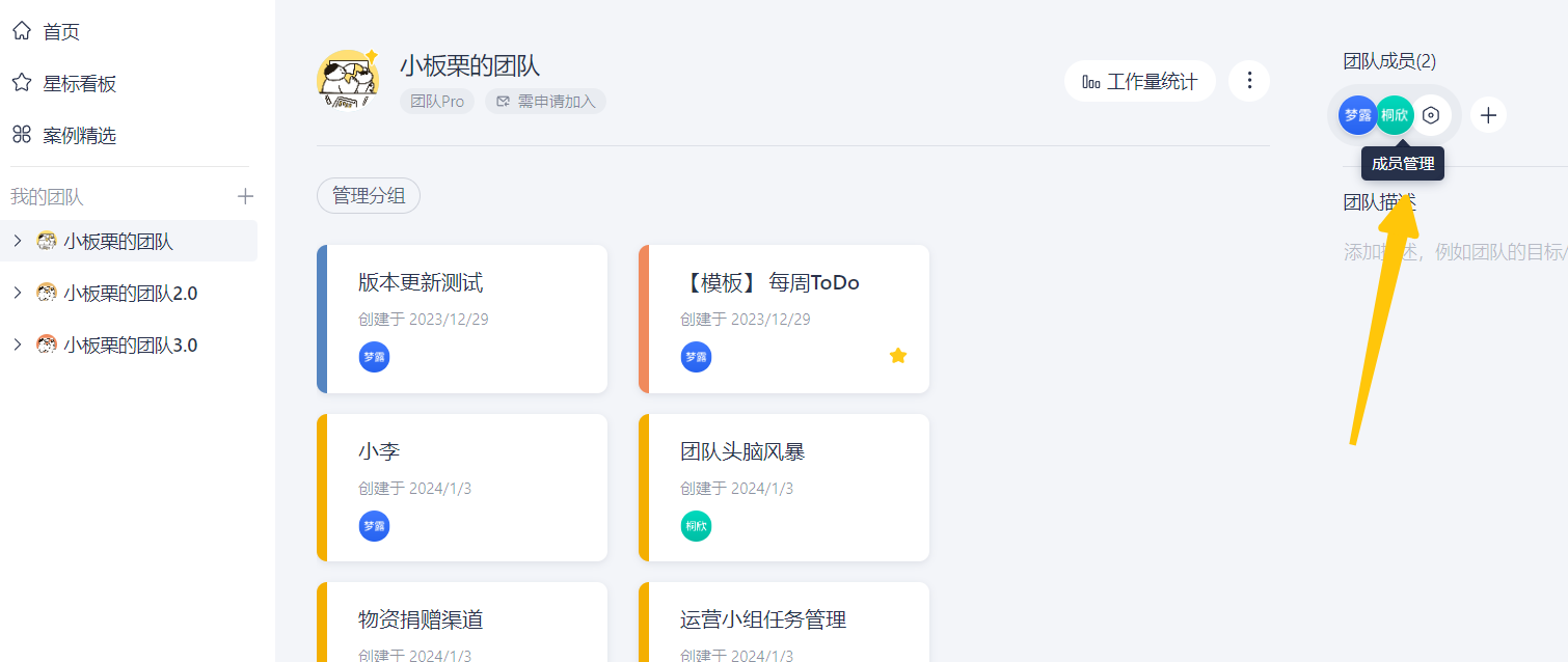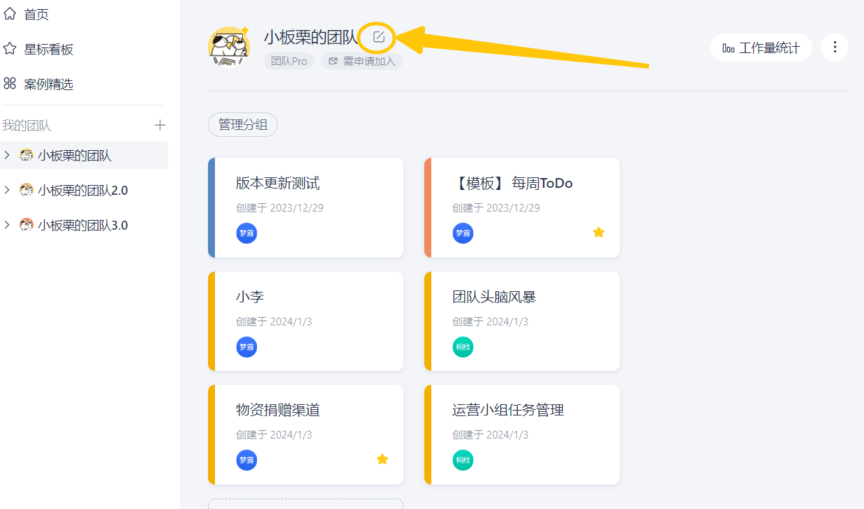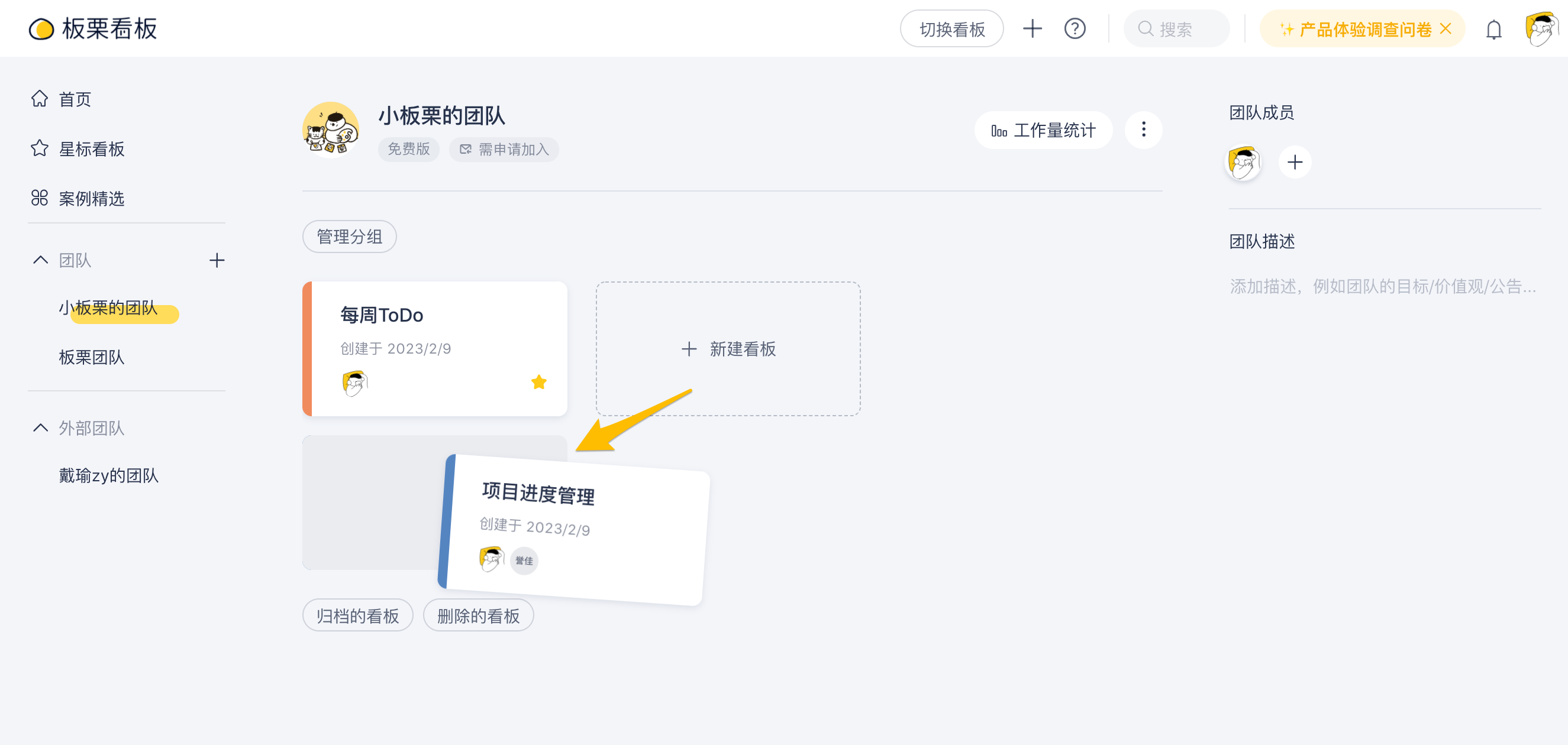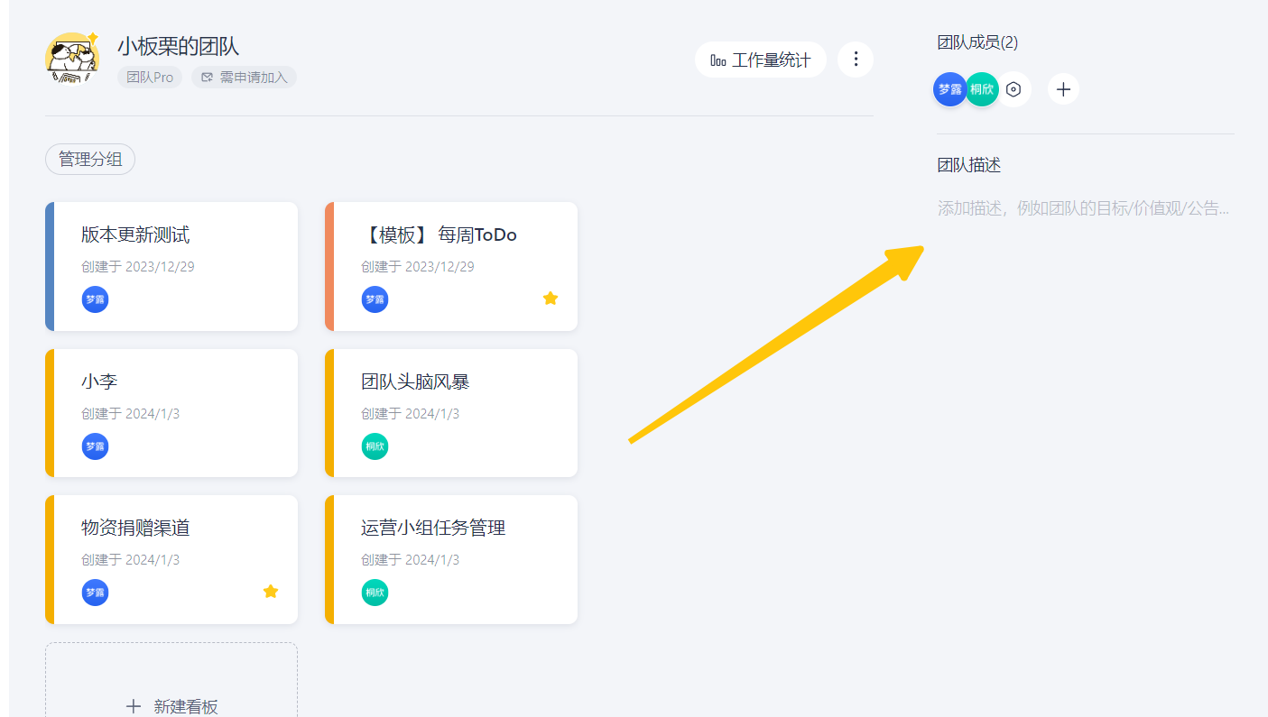 点击看板右侧「团队描述」处的灰色字体,即可对其进行修改。