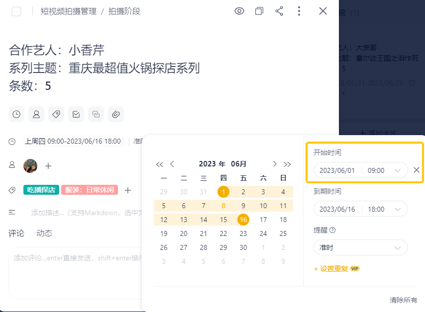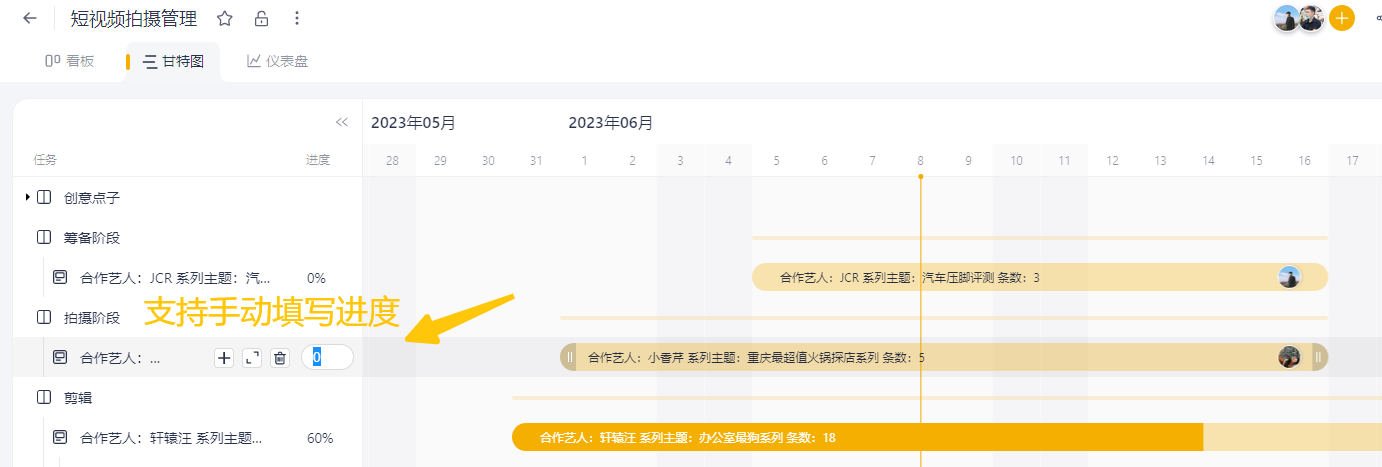 - 左侧栏卡片信息,支持手动填写进度,填写了进度后,会用“填色”的方式,在日期轴里直观体现。