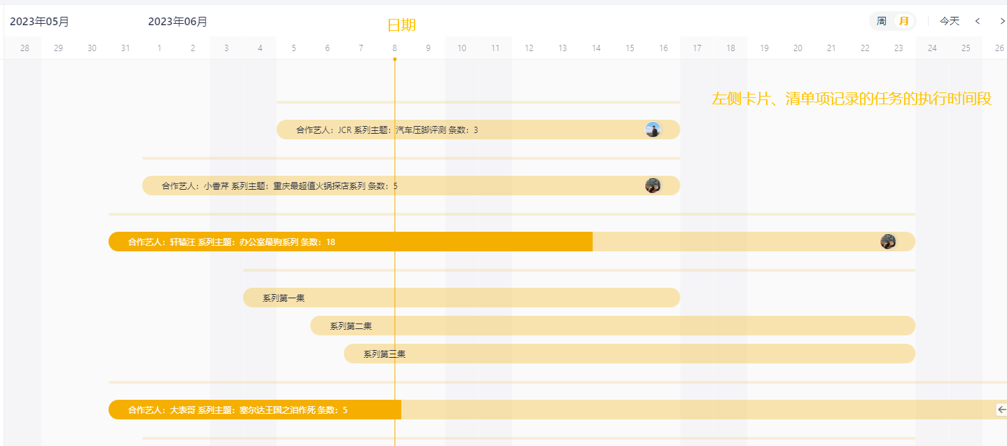 - 中心区域的横轴是时间,通常用于表示卡片、清单项中记载的任务信息的计划执行时间段(由开始时间与截止时间组成)