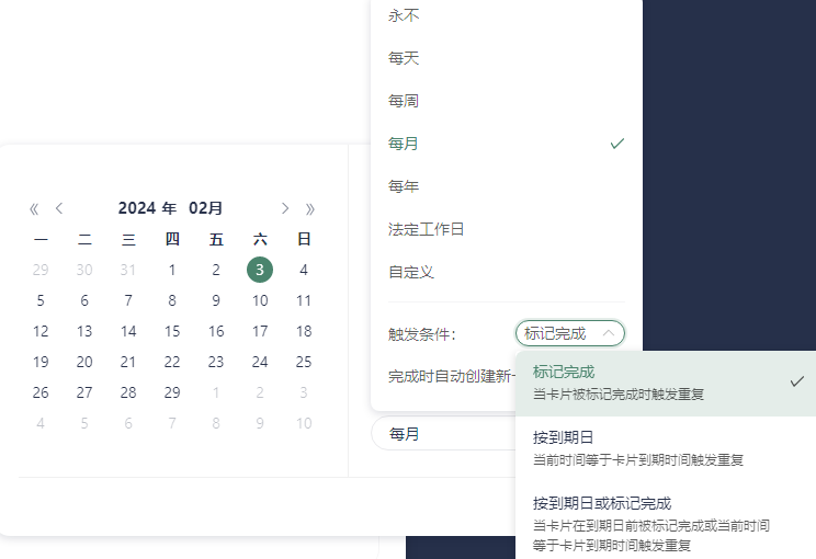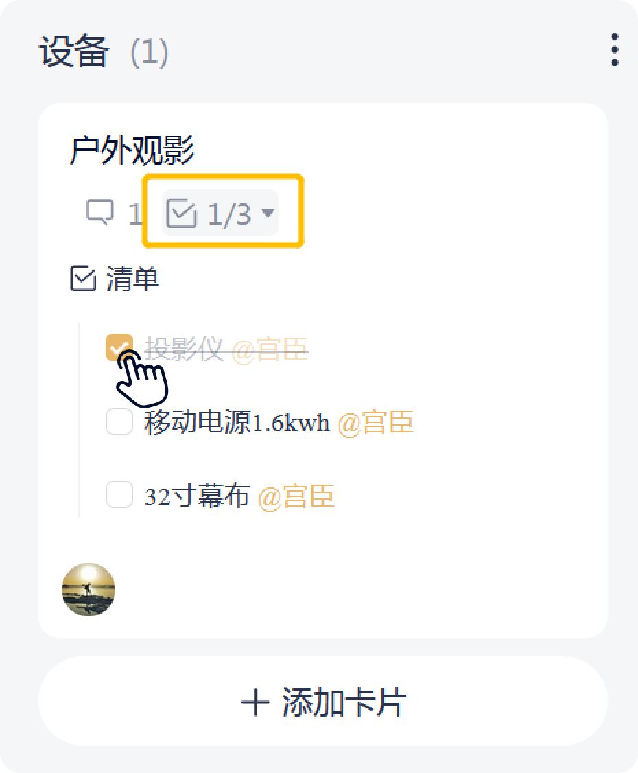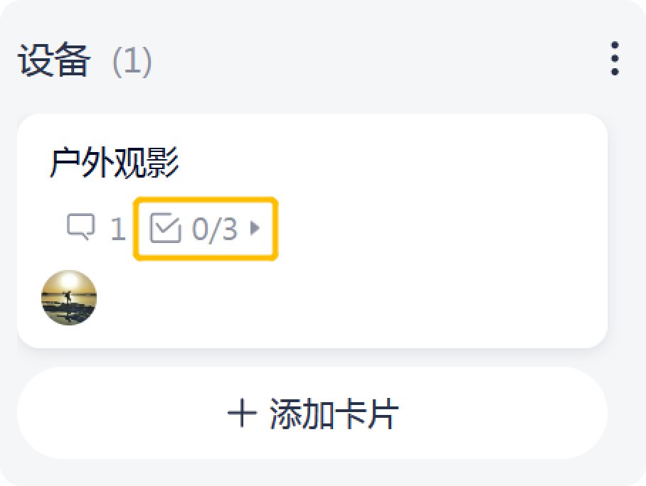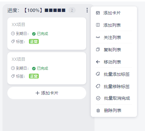 - 当进度填写为 100% 时,卡片会自动变成“已完成”状态