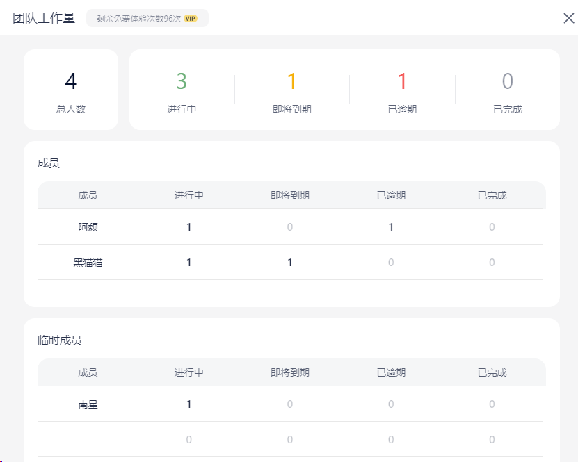 在首页右上角,可以点开“工作量统计”功能,从全局角度,查看每个团队成员的工作任务进展情况。