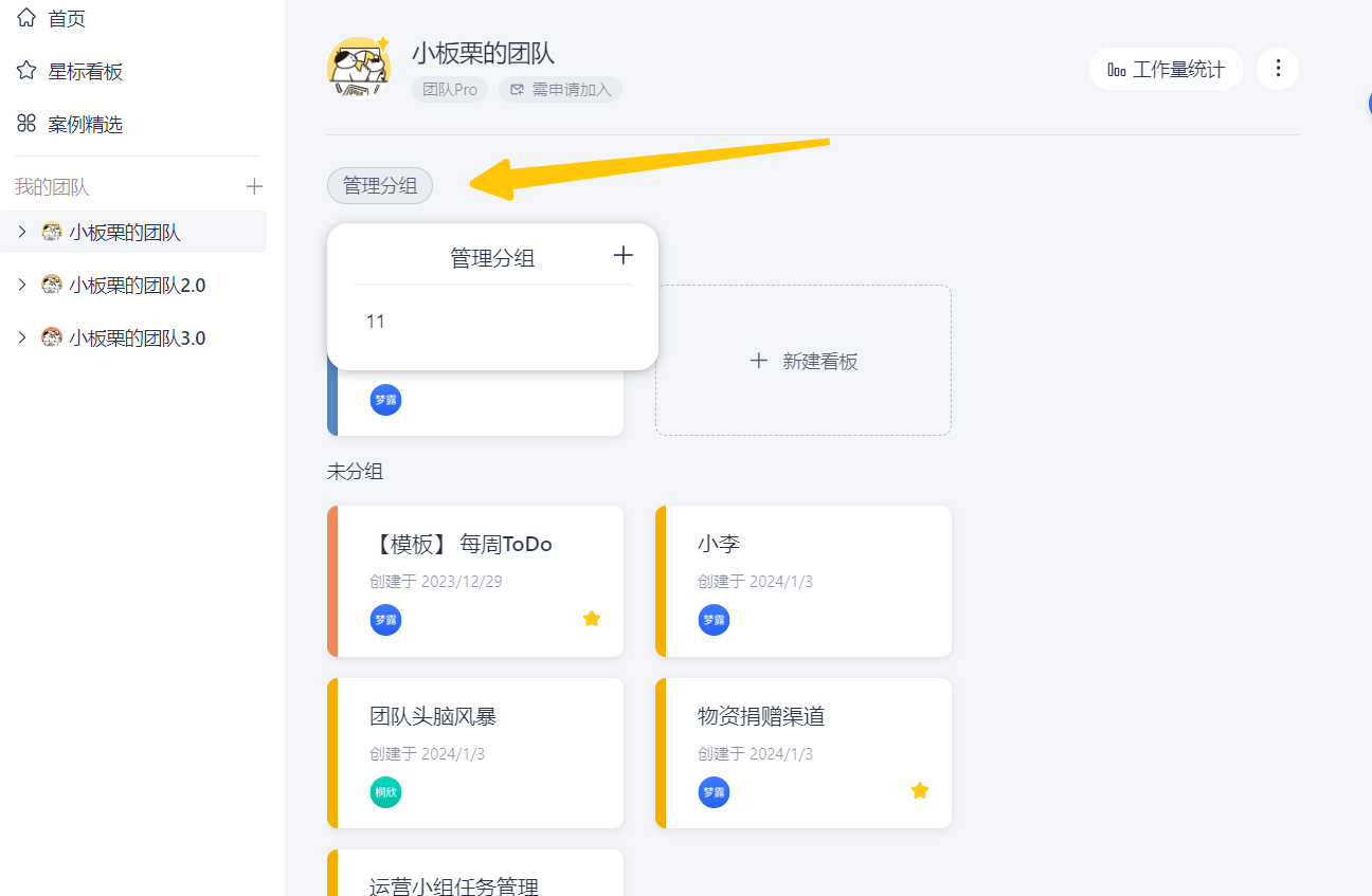 我们可以在团队中创建分组来对看板进行分类管理,团队成员可以看见所有分组。