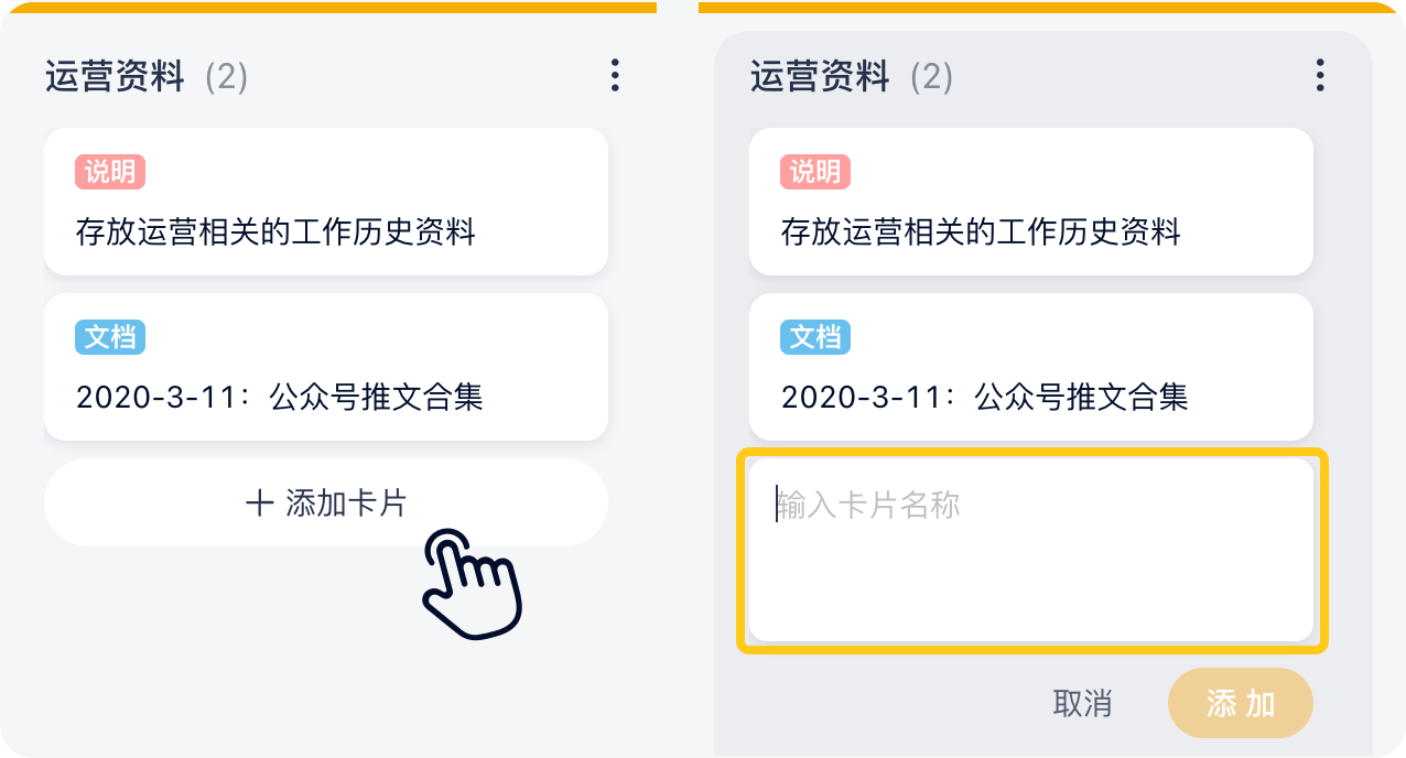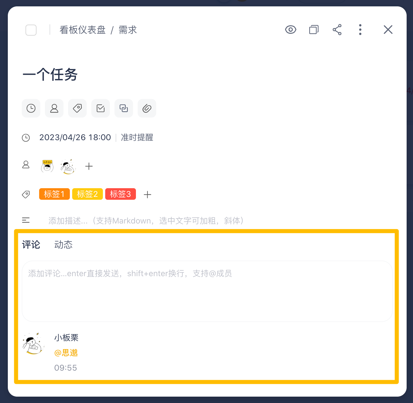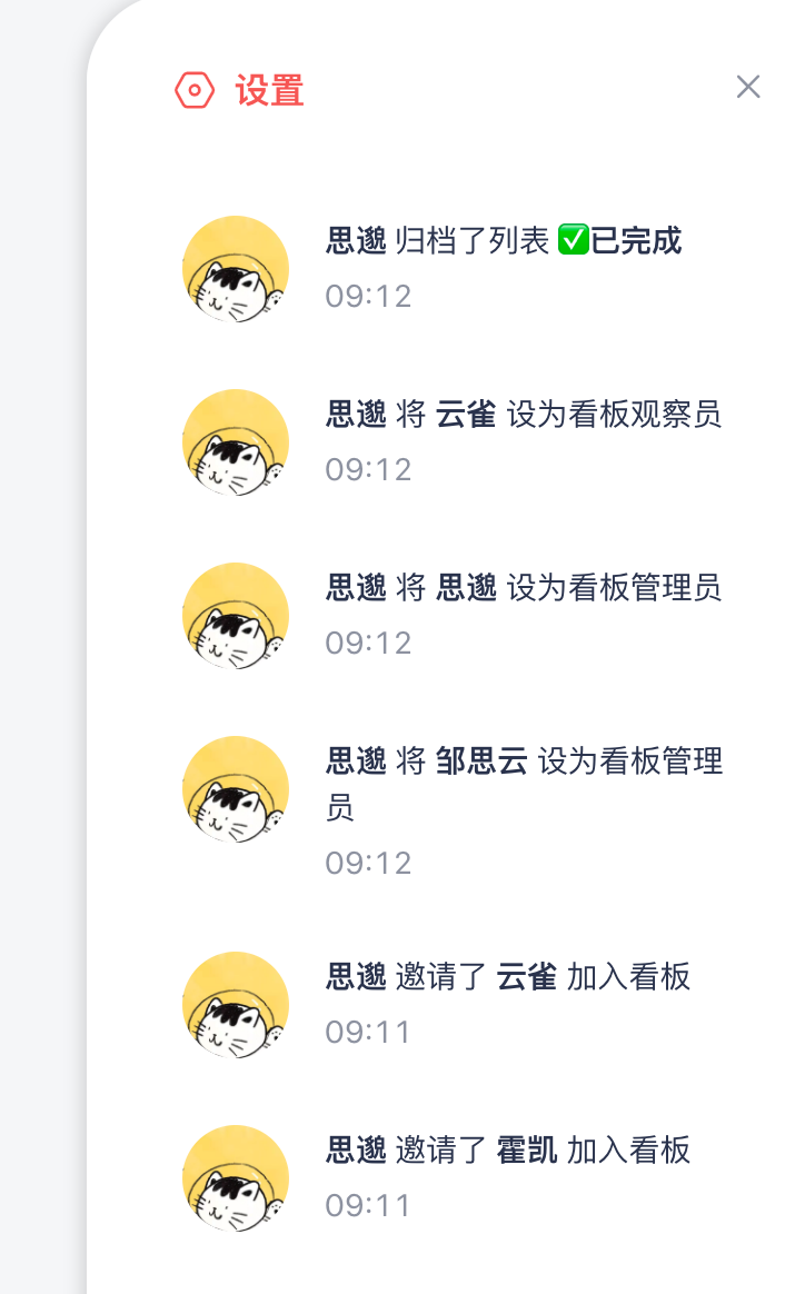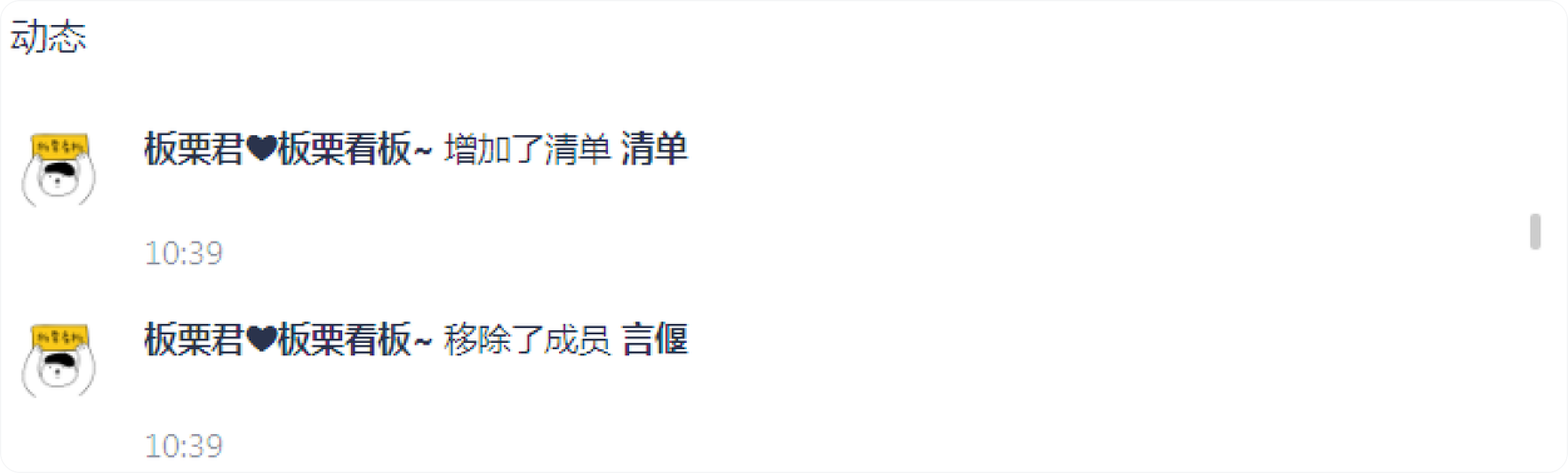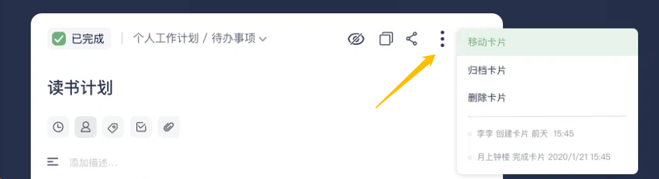 卡片内所有关键操作(包括:删除/归档/移动该卡片,以及完善该卡片细节时所进行的部分操作)及操作的时间,都会被记录在卡片详情页下方的动态中。
