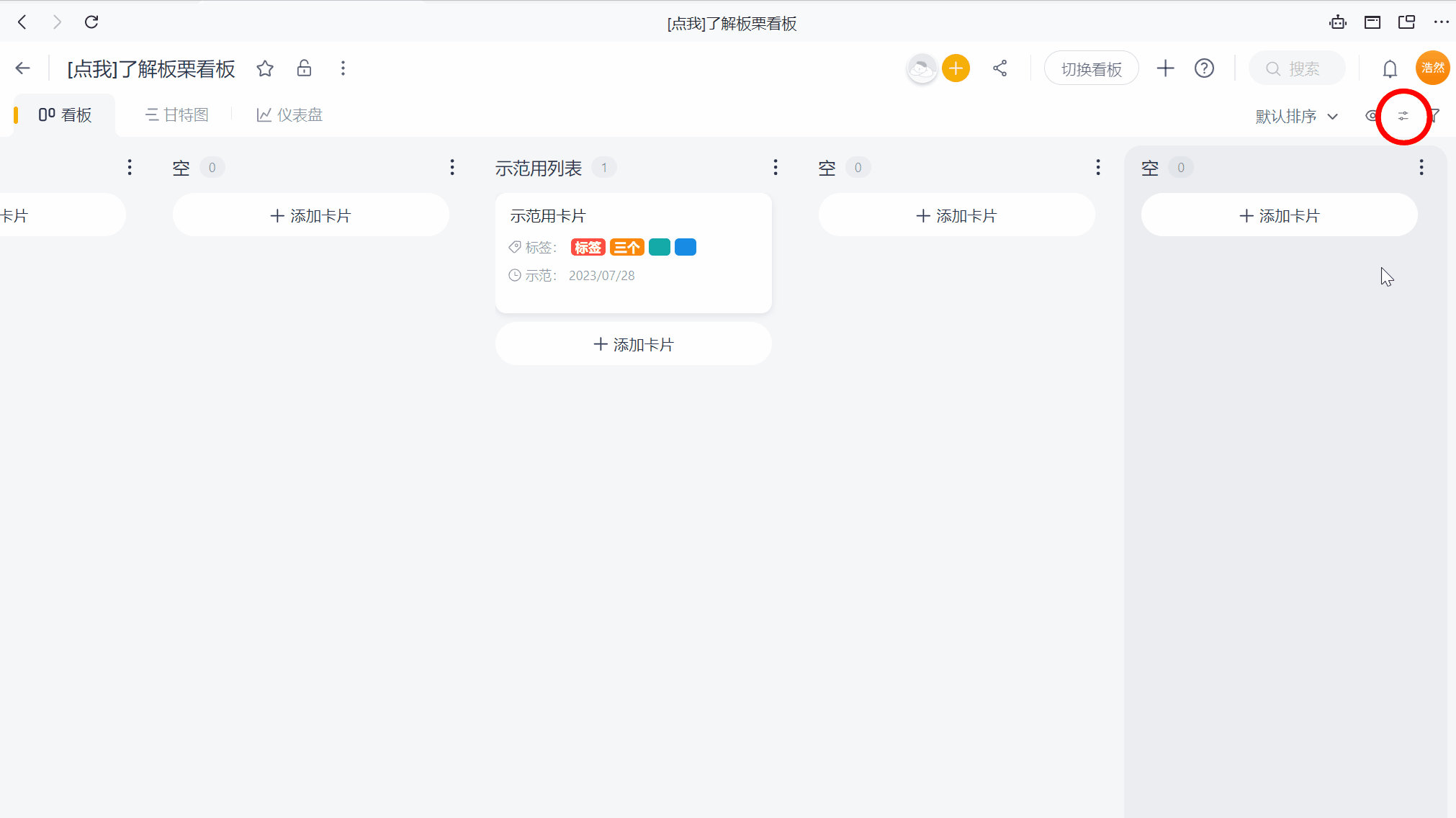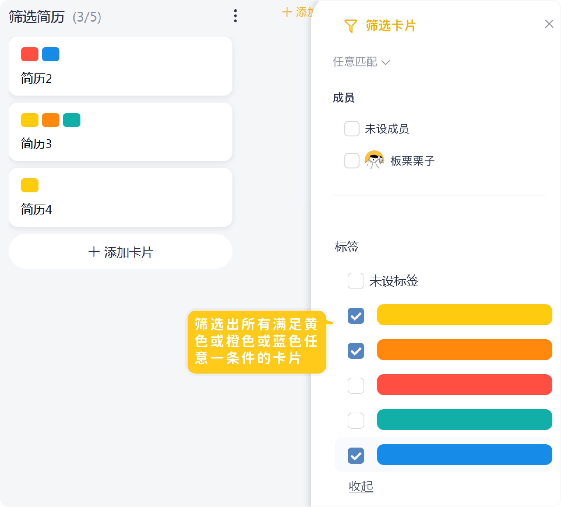 点击「筛选卡片」,可在看板中对成员、标签、到期时间、完成状态进行筛选。