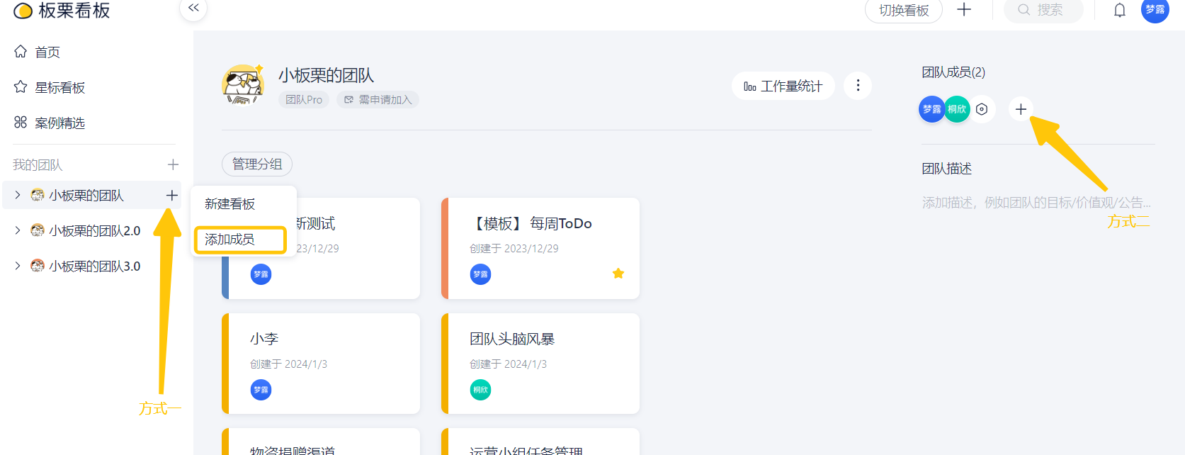 - 方式 2:点击团队头像右侧的「添加成员」,进行添加。