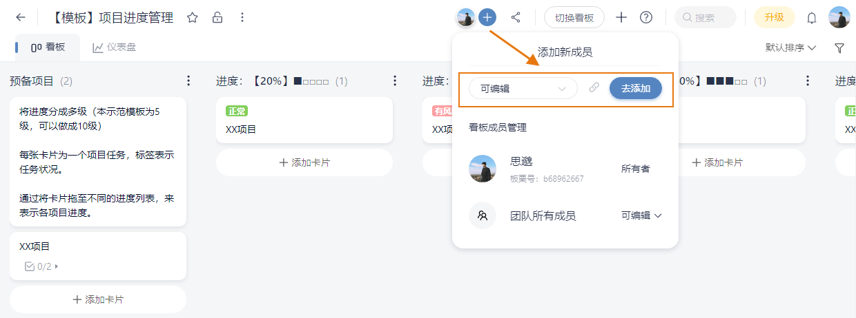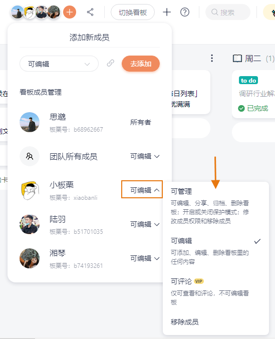 此处添加的是团队成员,团队成员可查看和操作此团队中全部看板。若仅参与部分看板,可在相关看板中邀请看板成员