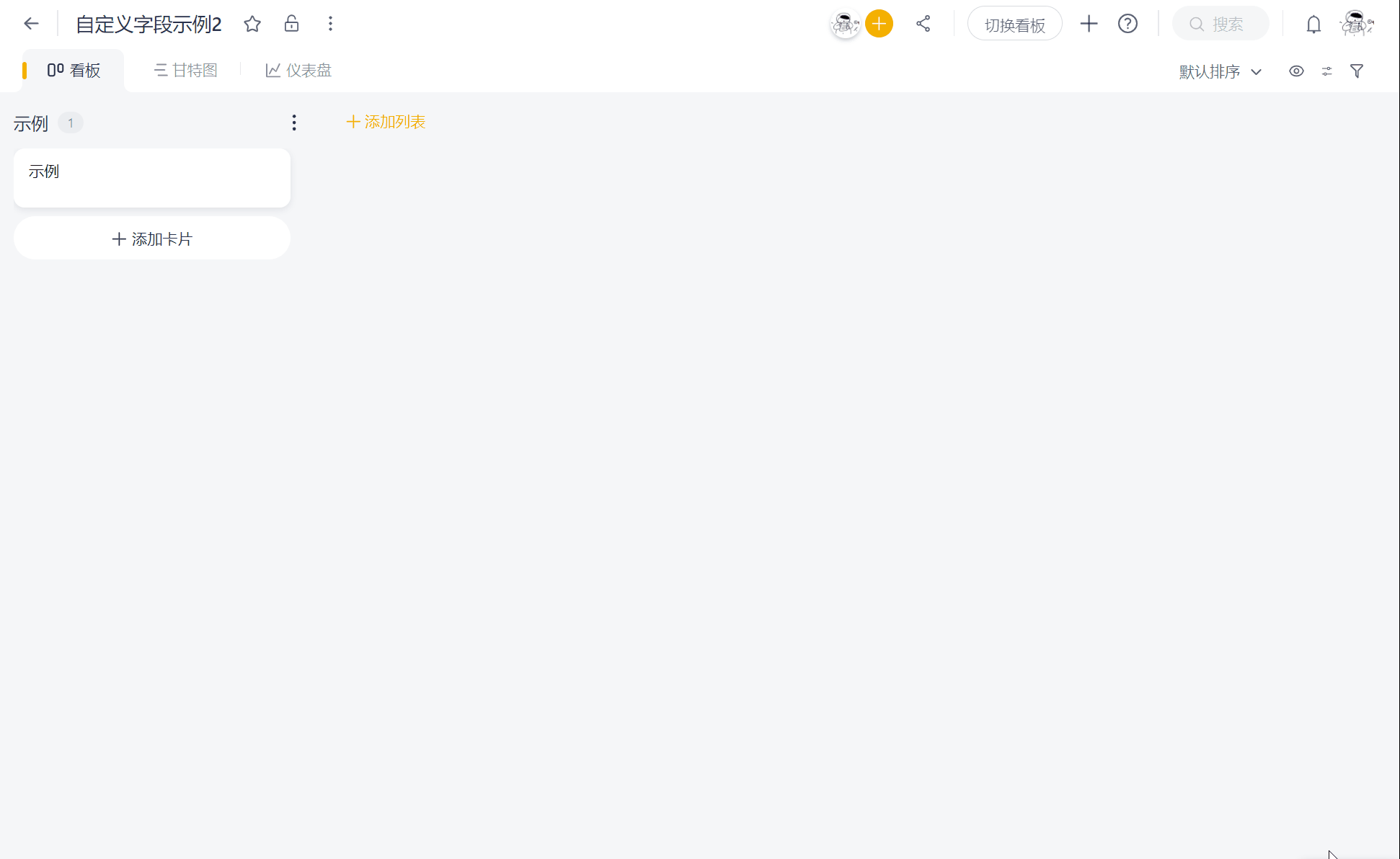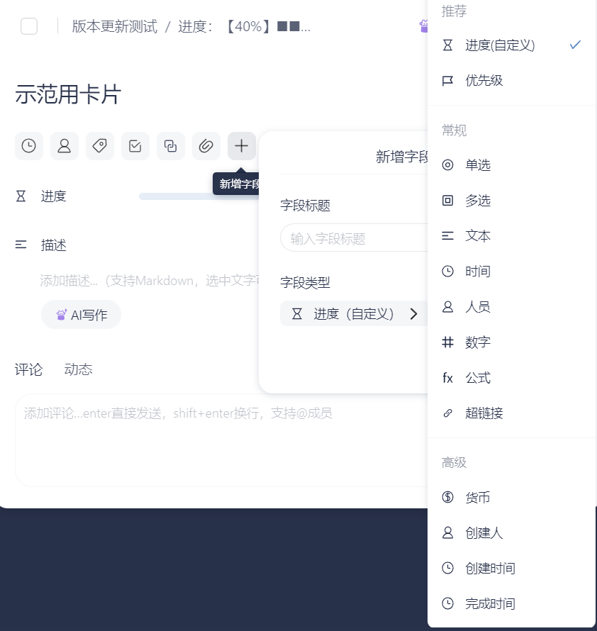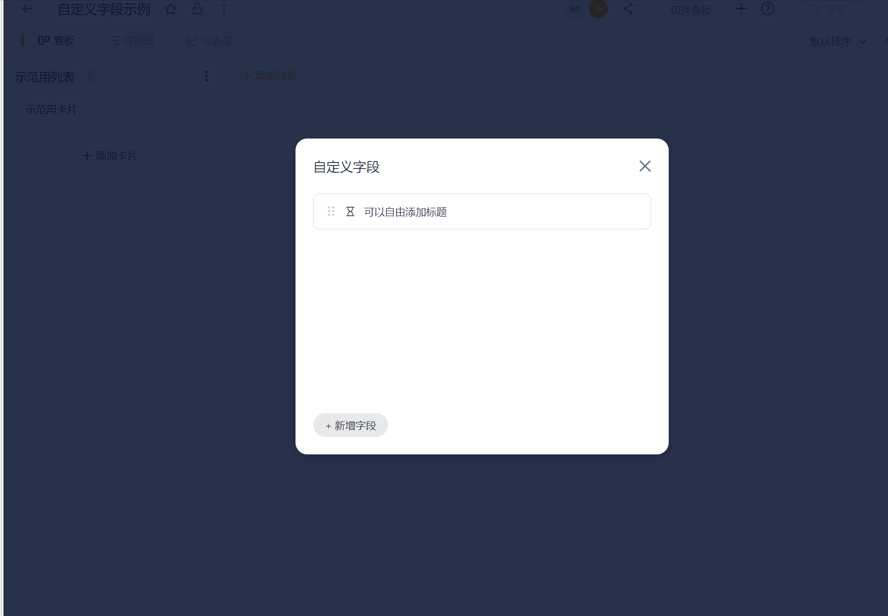 通过自定义字段的标题与选择所需要的字段类型,就能够设置出符合需求的字段了,例如,现在需要在卡片中添加名为“示范”的时间类型字段。