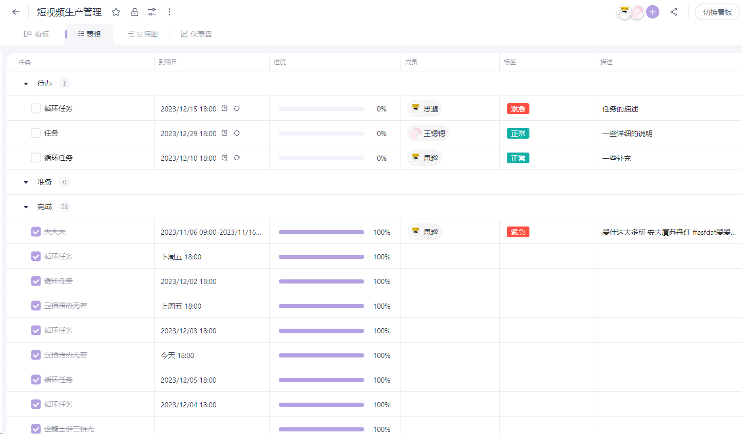 「甘特图」是基于看板中的列表、卡片、清单等内容生成,可以清晰标识出每个卡片、清单项的执行时间段(开始时间 + 结束时间)、执行人、以及百分比进度;便于管理者站在时间轴的视野角度,弄清项目的剩余任务,评估工作进度。是经典的计划/生产/时间管理工具。