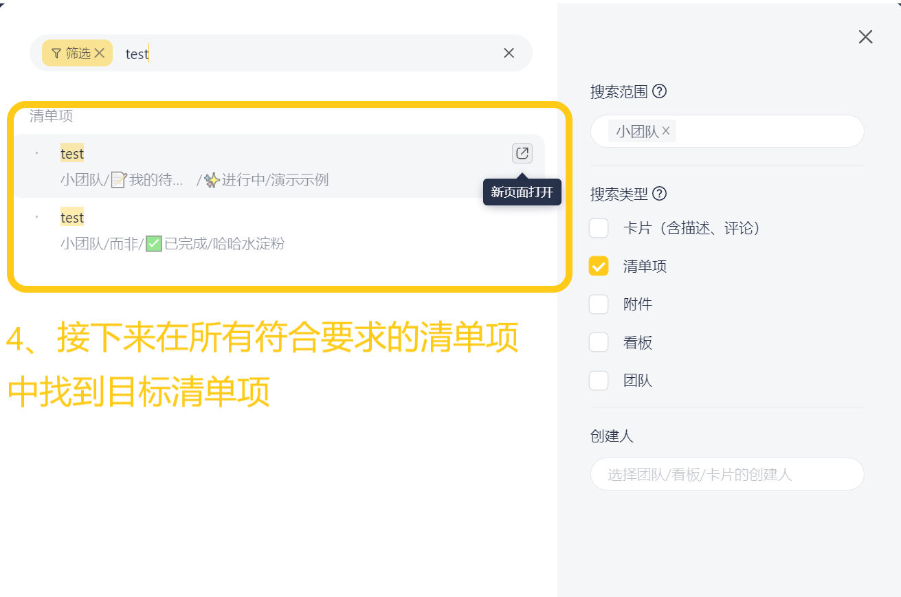 接下来以下图中此卡片以及清单项“test”为搜索目标,演示全局搜索的用法