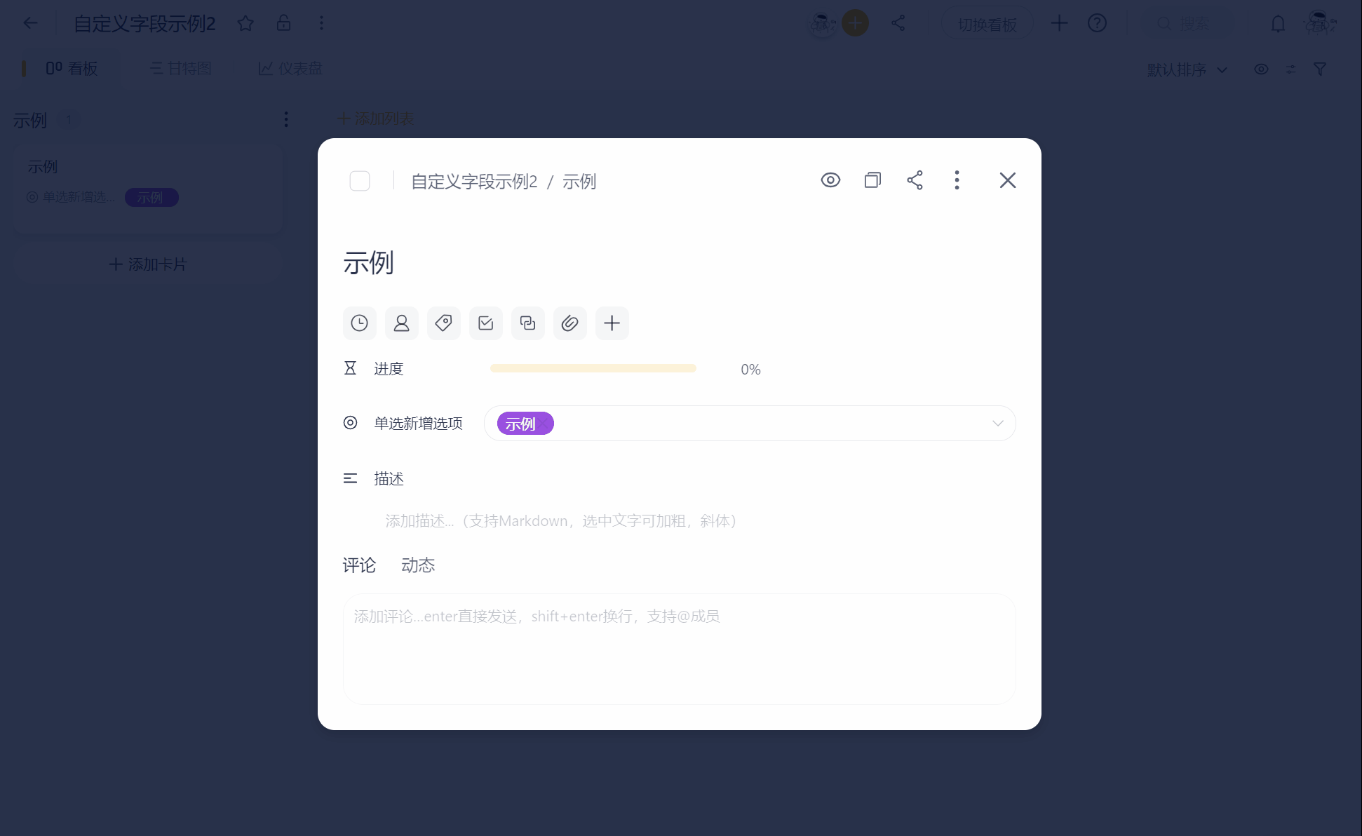 字段是卡片承载各种信息的载体(常见字段如:时间、成员、描述等)。而板栗看板新上线「自定义字段」功能,支持创建多种字段类型、对字段进行自由命名、以及自由配置卡片封面上显示哪些字段。详情:[「自定义字段」:打造标准化任务模板,提升信息传递效率]
