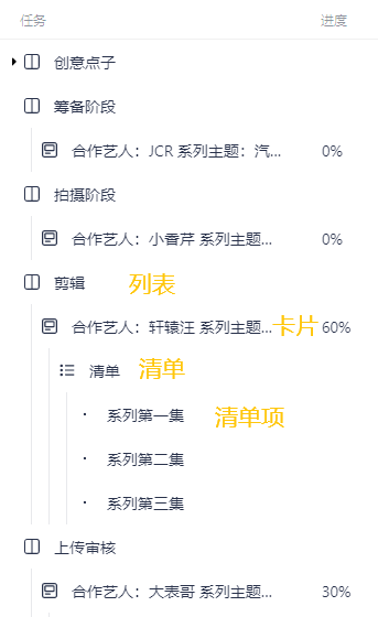 最左侧的纵轴,将同步当前看板中的列表 + 卡片 + 清单项信息。我们可以在这个区域对这些信息进行编辑或调整顺序,操作会生效同步到看板界面。