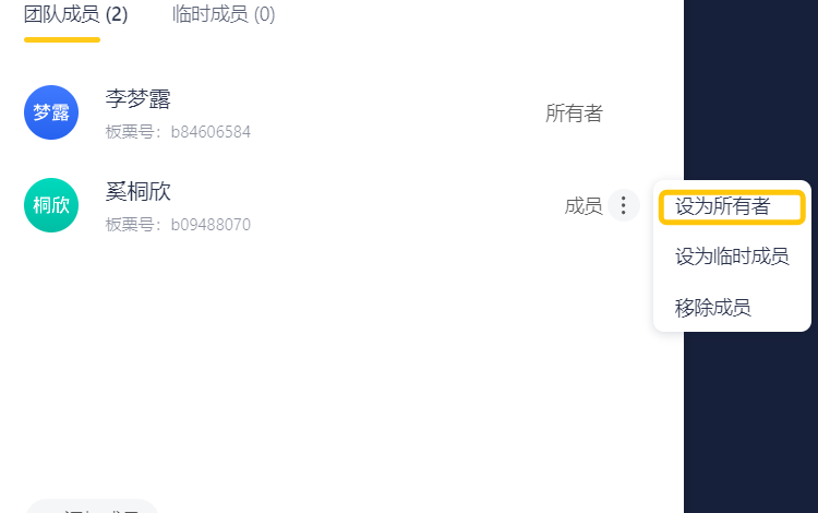 可将任一团队成员设置为(团队)所有者,完成团队所有权的转移。