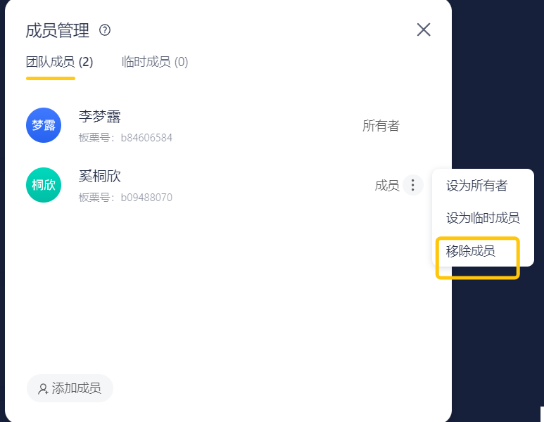 注:移除成员后,该成员将从团队中的所有看板里退出,并将拥有的看板所有权移交给团队管理员。
