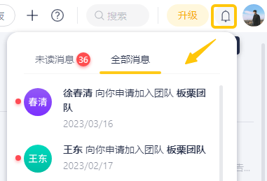 当你所创建、参与的所有看板、卡片的产生重要操作时,你将在右上角的「通知」里收到提醒消息。