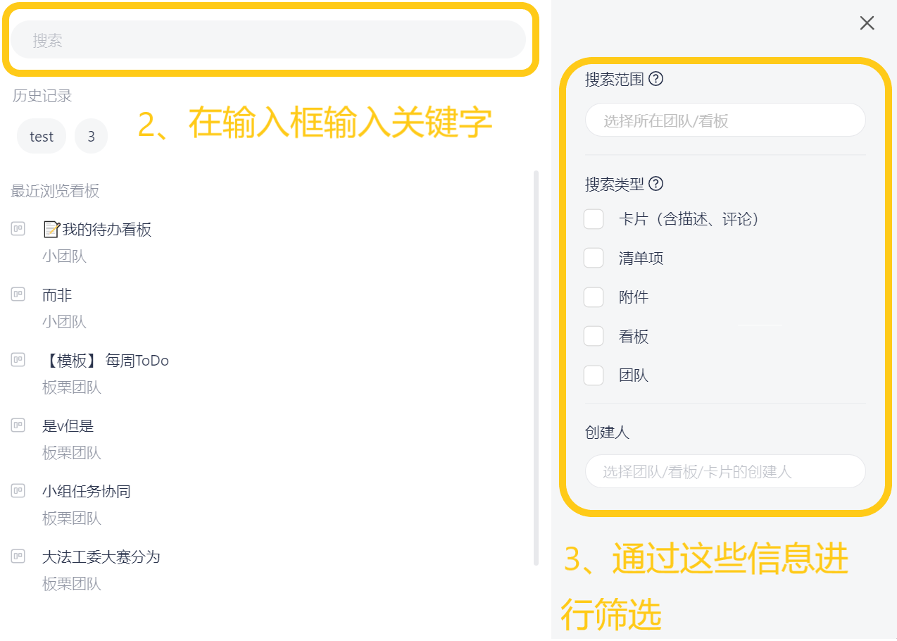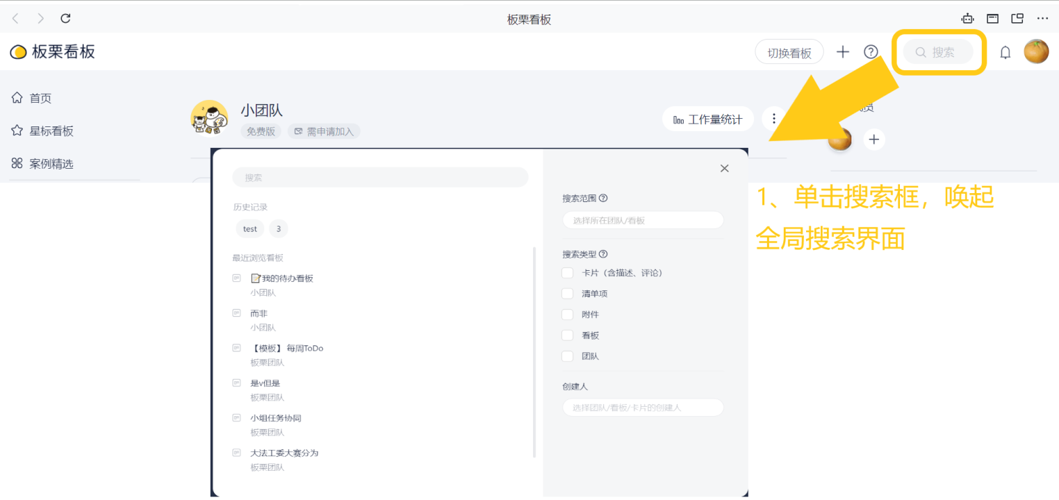 单击搜索框,打开搜索弹窗,通过输入目标内容的各项关键字,能够准确并且迅速地搜索加入应用的所有看板、卡片(包含已归档的看板与卡片)、卡片元素信息。