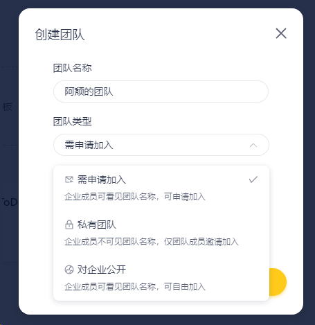 创建团队和管理团队时,我们都能设置团队类型,即规定团队的可视范围,目前有三种类型: