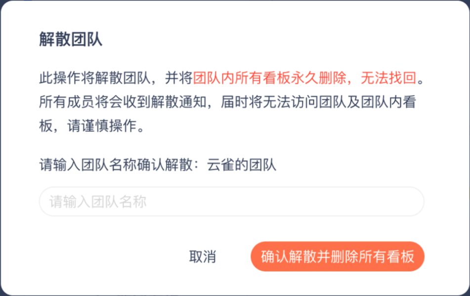 将整个团队解散,并且删除团队内所有看板,且无法找回,请慎重操作!