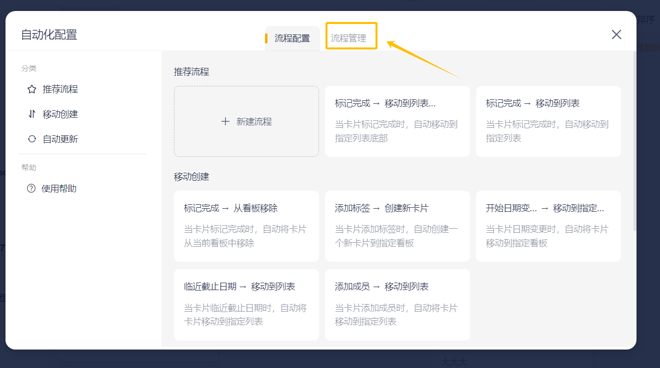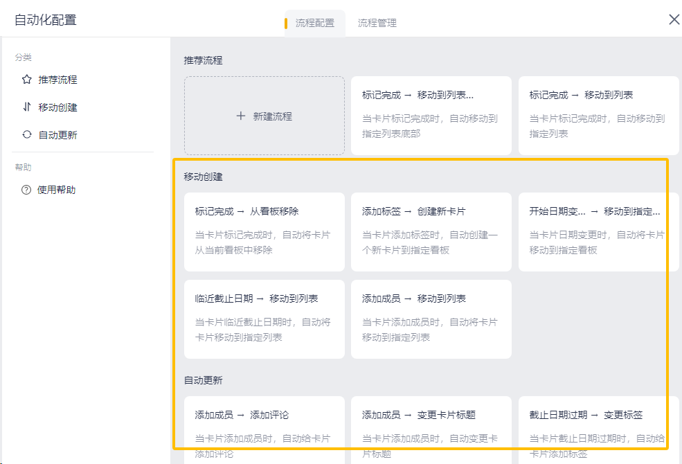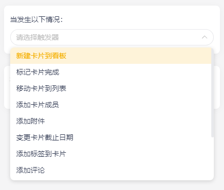 这里需要我们设置出自动化流程开始的先决条件。当我们在看板上确定进行某一种操作后,将会触发自动化流程。可选择新建卡片到看板、标记卡片完成、移动卡片到列表、添加卡片成员、添加列表等 12 条规则。