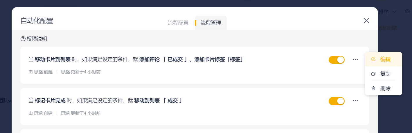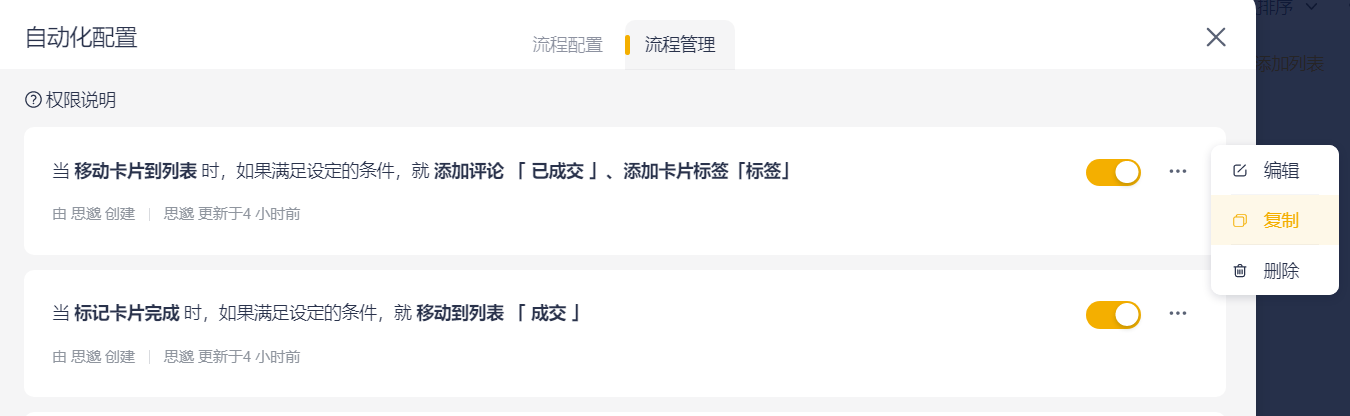 自动化流程创建成功后,进入“流程管理”,可随时对已生成的自动化流程进行关闭、删除、复制、编辑操作。
