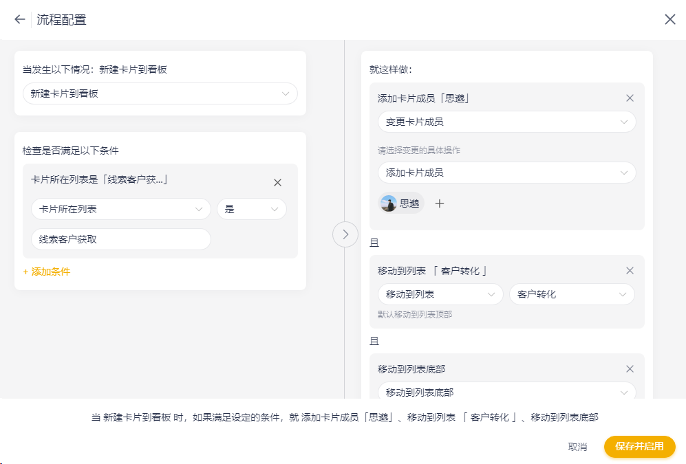 - 流程配置过程:我在「当发生以下情况」中,选择“新建卡片到看板”;在「检查是否满足以下条件」中选择“卡片所在列表”“是”“线索客户获取”;在「就这样做」中,选择“添加卡片成员-思邈”,并且“移动到列表「客户转化」”;最后选择“保存并启用”。