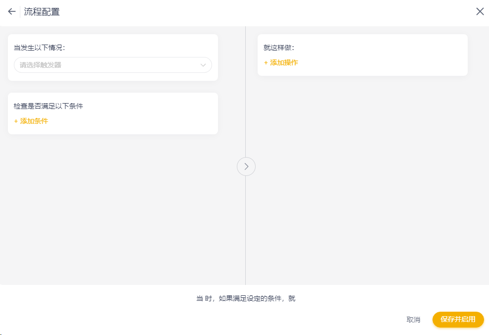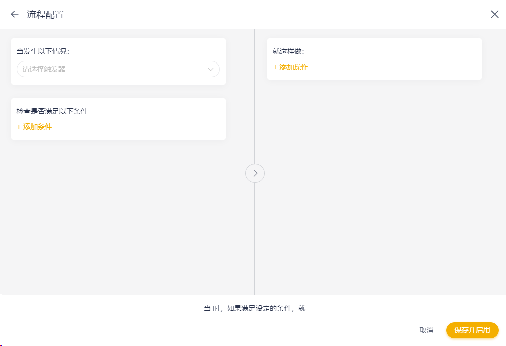 - 进入流程配置主界面后,我们将看到三个添加项,对应自动化流程因果和条件关系。