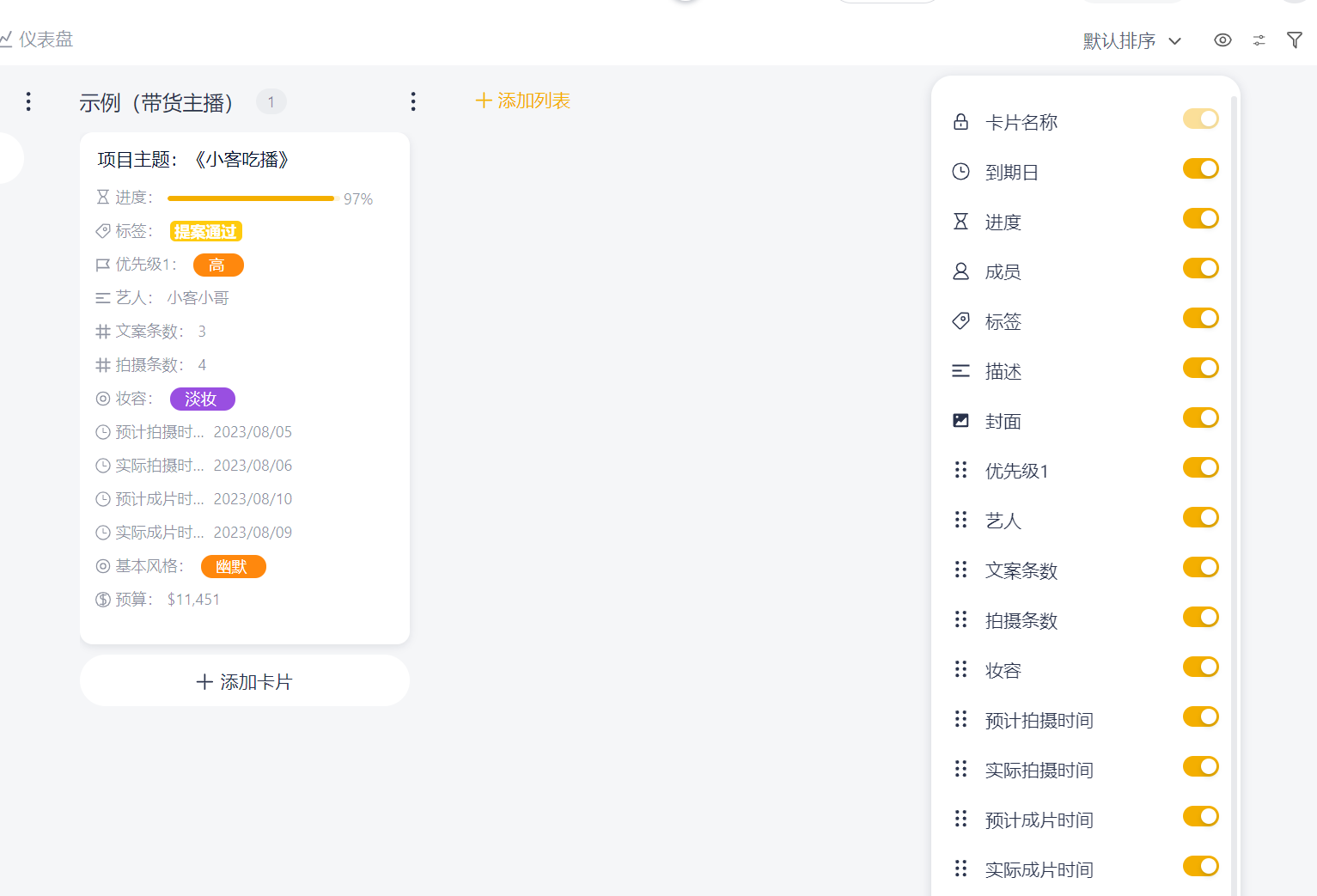 需要说明的是:看板中存在一些设定好的字段,因而打开封面设置时,会发现有很多行选项;一些类型的字段中若没有填写内容,例如文本字段、时间字段,即使在封面设置中设定为“打开”状态,也是不会显示的