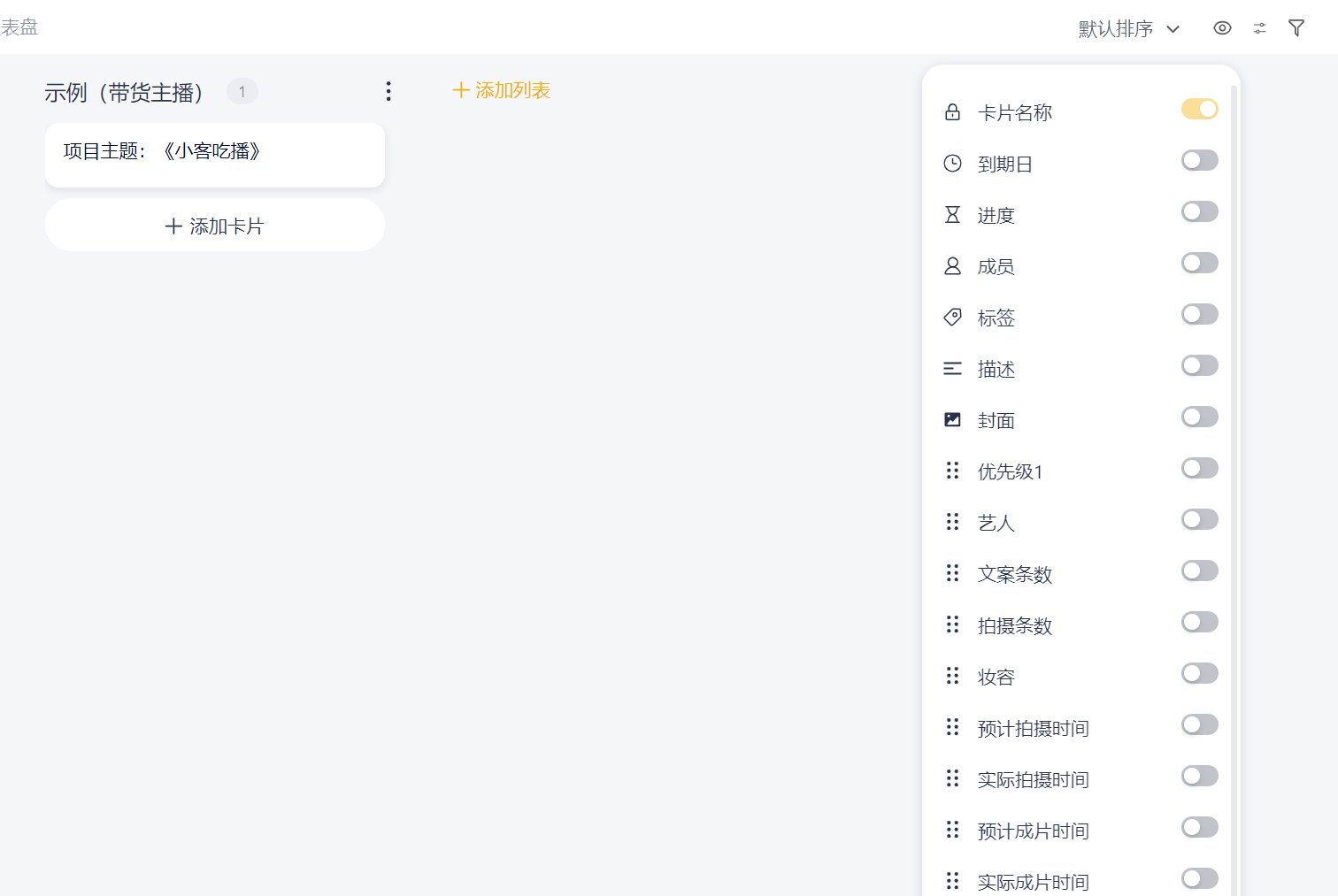 通过选择看板界面右上角的“眼睛按钮”,打开设置界面,就可以选择字段的显示与隐藏。