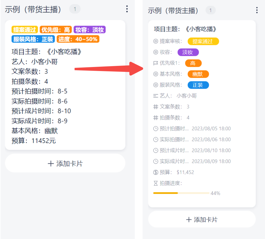 用户可以根据自身的需求,自由地决定卡片封面显示哪些字段,即可以突出重要信息,又尽可能控制信息泛滥。