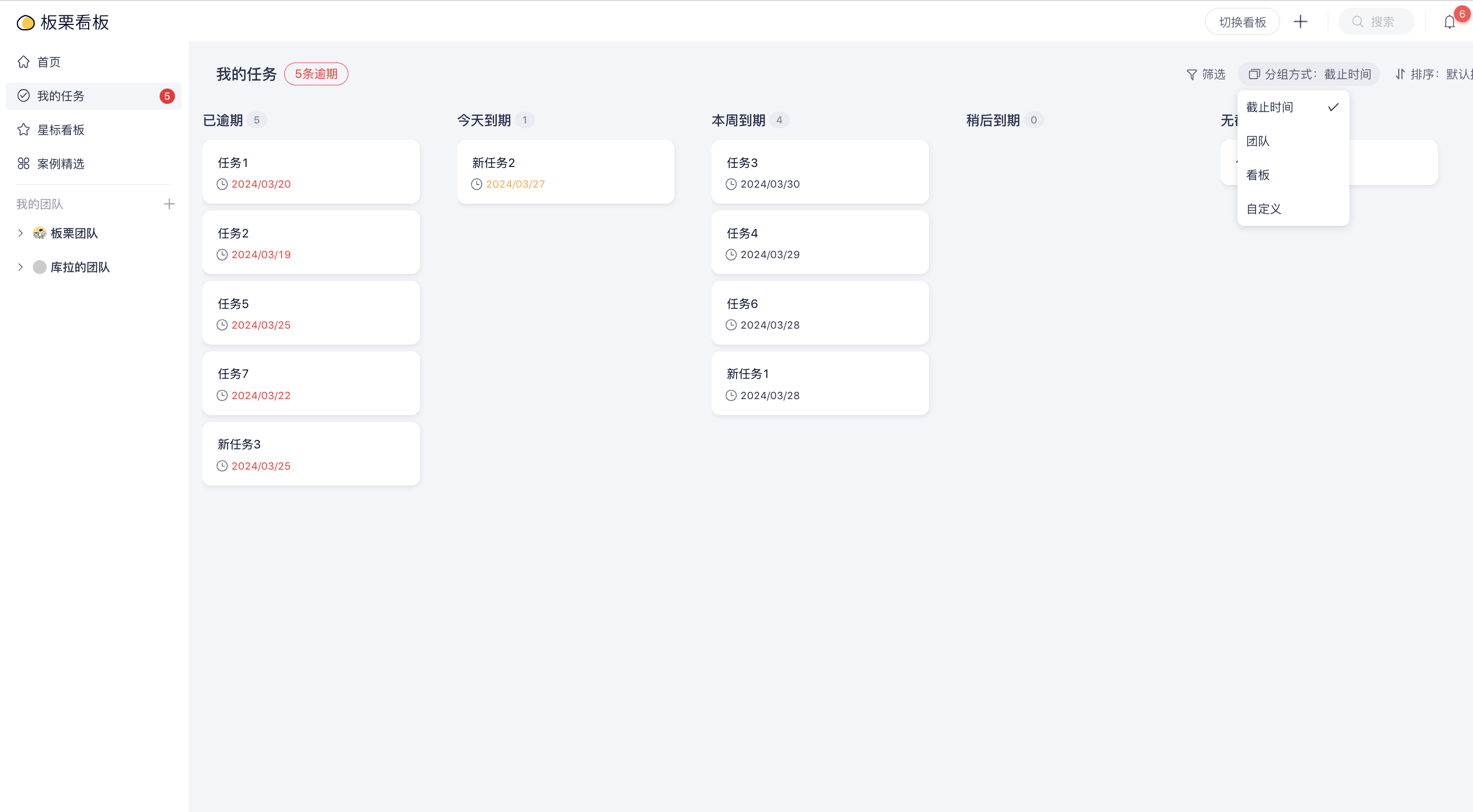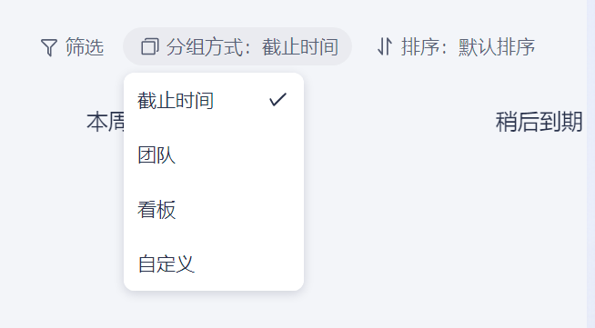 目前按四种方式进行分组:截止时间(默认)、团队、看板、自定义