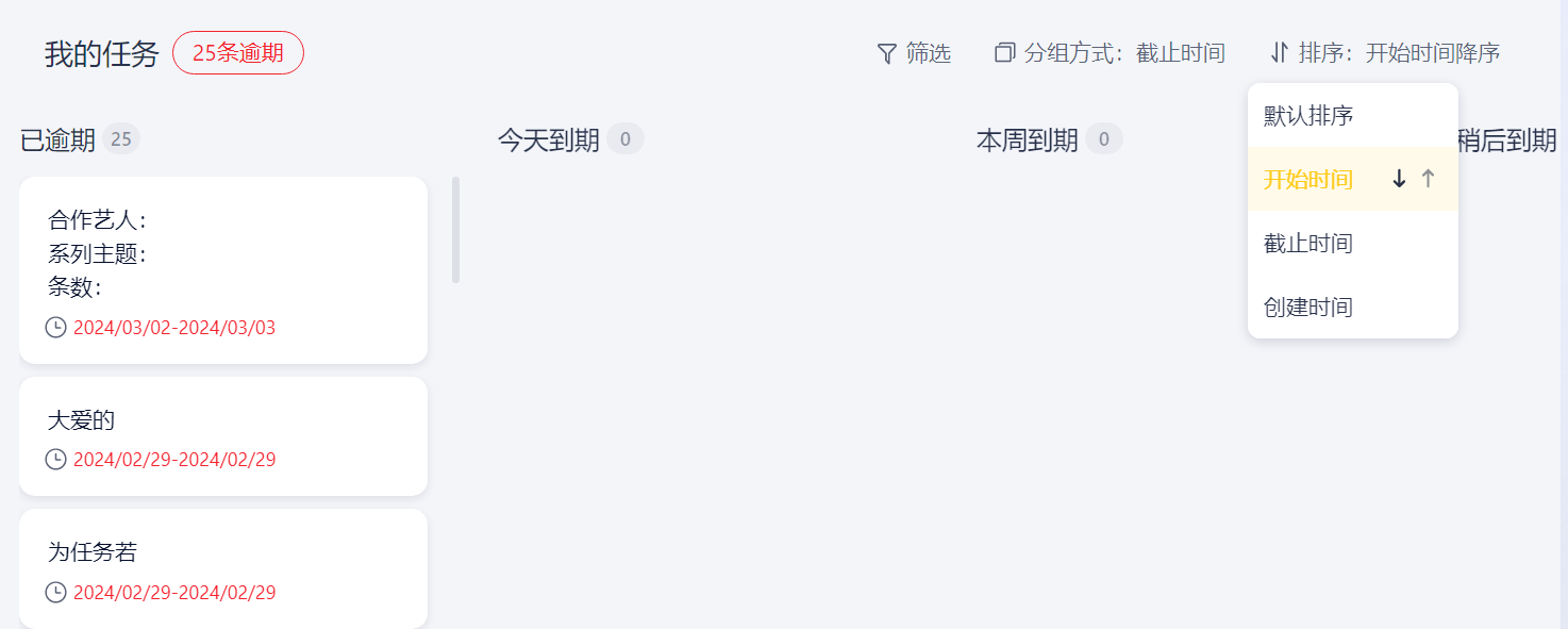 - 开始时间:根据任务卡片开始时间的早晚,进行正向与倒向排序;